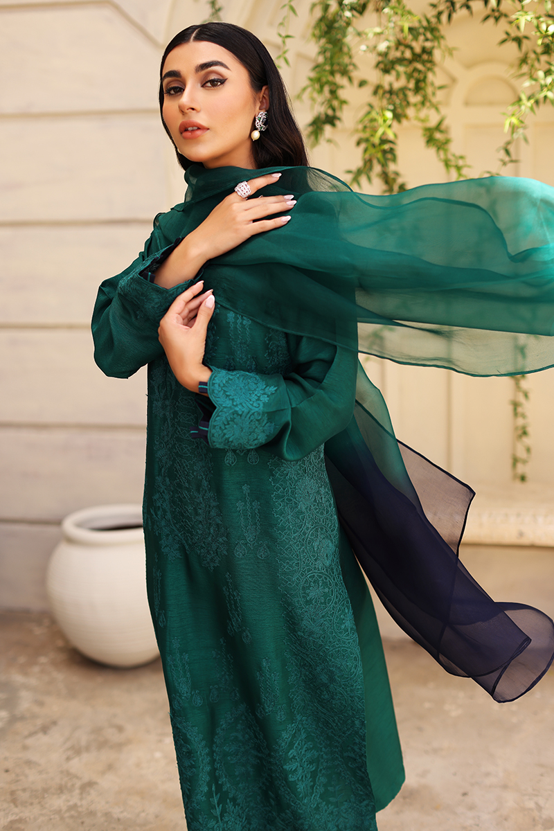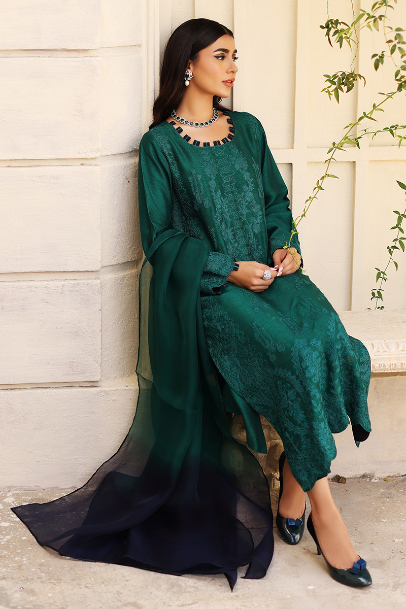 An emerald base korean silk canvas adorned with embroidery all over. Matching dupatta and pants can be paired to elevates your look this season.