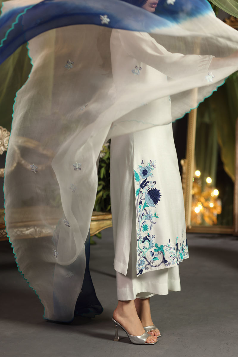 This ice blue ensemble in Khaadi silk features intricate applique embroidery on the daman, neckline, and sleeves, adding a delicate, refined touch. The shirt is paired with matching Khaadi silk culottes, offering both comfort and style. The organza dupatta in an ombre shade, beautifully adorned with an embroidered booti spray and scalloped embroidery on all four sides, bringing an elevated charm to this stunning outfit.