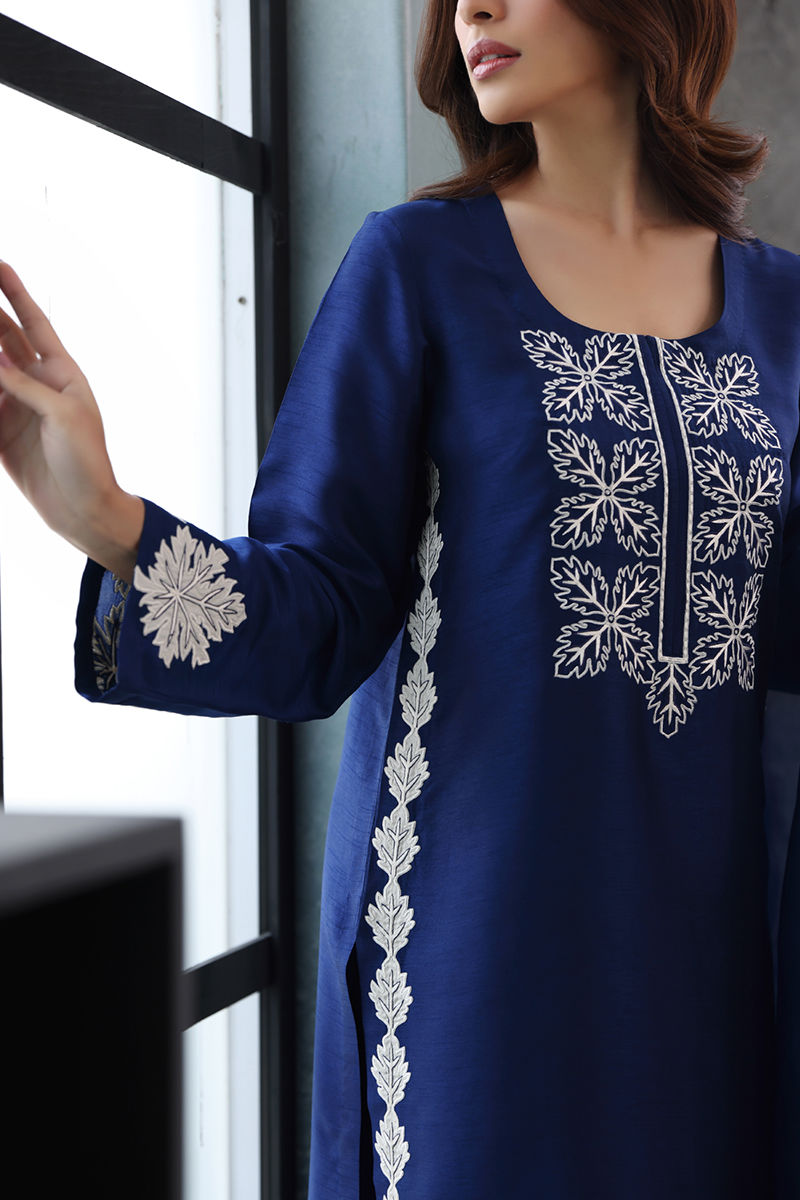 Dress in refined elegance with a navy blue raw silk long shirt, adorned with intricate embroidery appliqué on side slits and daman, adding a touch of sophistication to its silhouette. The neckline features delicate embroidery, enhancing the shirt's overall allure. Complete the ensemble with an organza dupatta, showcasing embroidery along the borders for a perfect blend of style and grace. The length of the shirt is 48 inches.