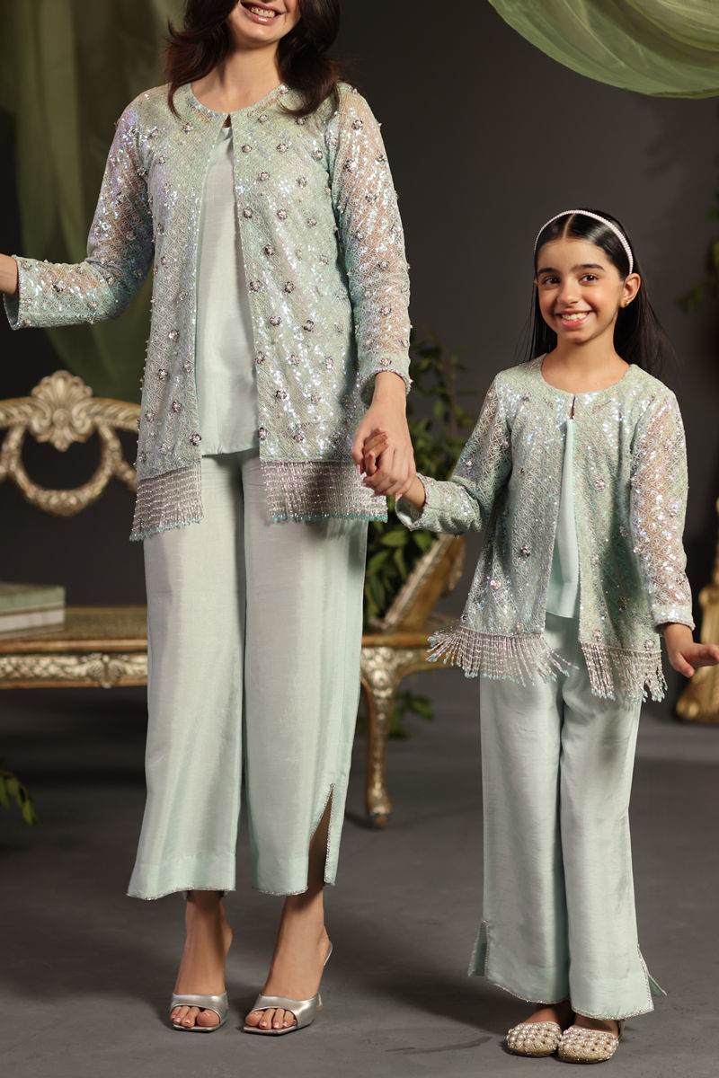 The Amayla dress combines sophistication and charm with a net sequins jacket, adorned with stones, pearls, Swarovski crystals, and hanging drops. The jacket, with a tassel detail, pairs beautifully with a slip and pant in raw silk. The culottes feature hand-embellished Swarovski on the slit, adding a touch of elegance to the look. Perfect for special occasions, this ensemble offers both style and grace.