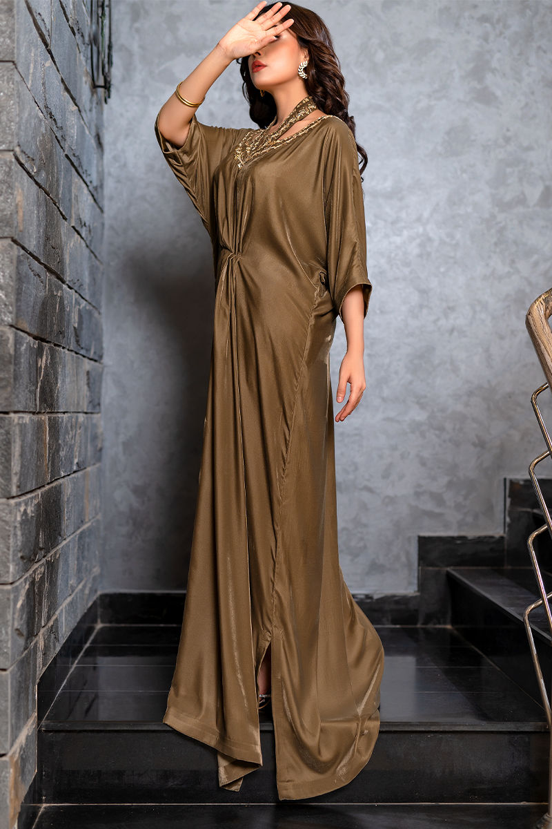 Embrace your inner royal with this olive green velvet kaftan with minimal detailing on the neckline. This outfit emanates elegance and royalty through and through.