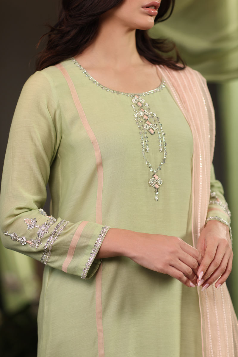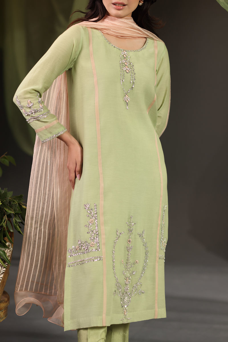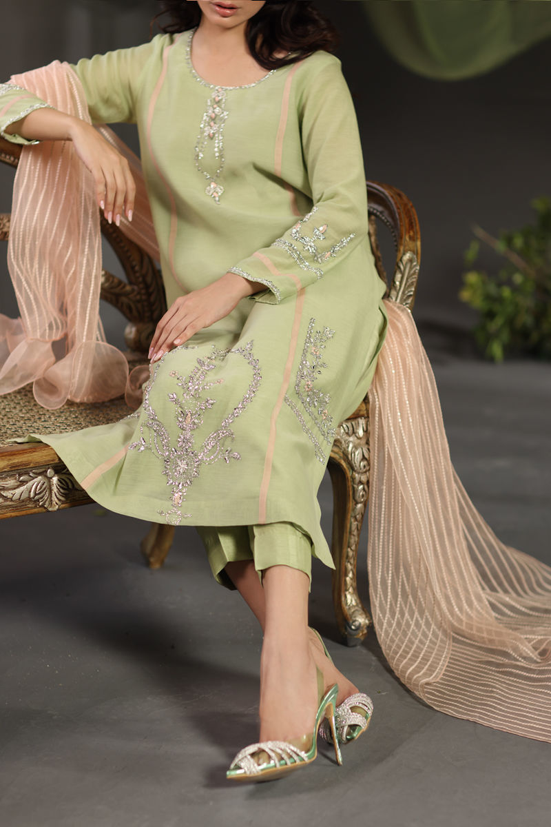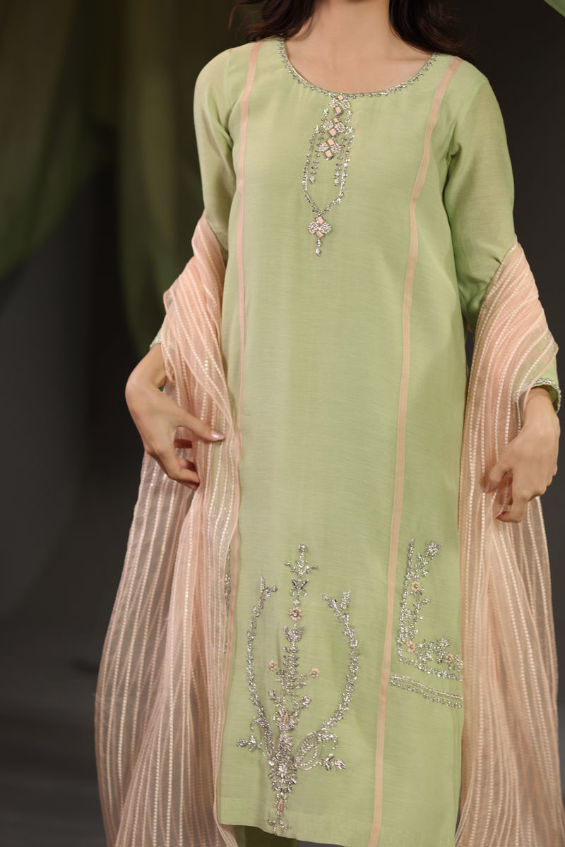 Color: Light Green & Pink Fabric: Cotton Silk and Organza Work Details: Hand Embellished Resham, Dabka, & Sequins