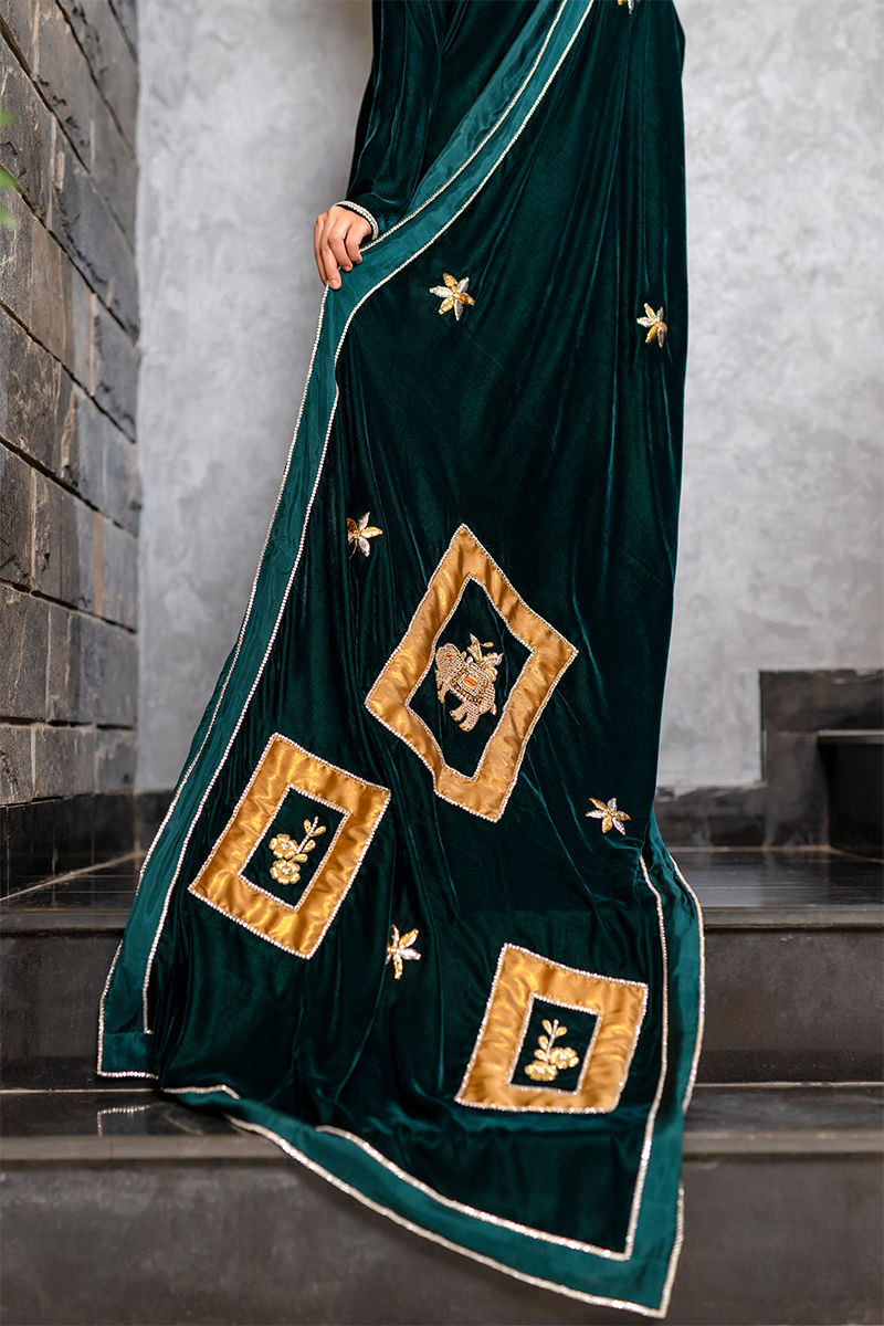 Color: Green, Gold Fabric: Elvet, Korean Silk Work Details: Dabka, Zari, Mukesh, Swavroski, Resham Embroidery