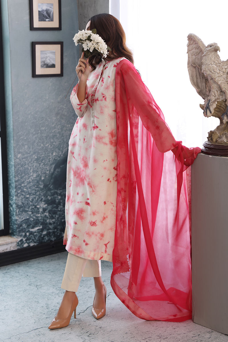 Drape yourself in elegance with a mesmerizing organza silk tie-and-dye shirt, featuring intricate tilla embroidery on the neckline, adding a touch of regality. Paired with plain cotton pants, the ensemble exudes understated sophistication. Elevate the look with an organza net dupatta, adorned with tie-and-dye patti all around and embroidery on all sides, creating a harmonious blend of traditional charm and contemporary style. The length of the shirt is 46 inches and the pants length is 36 inches.