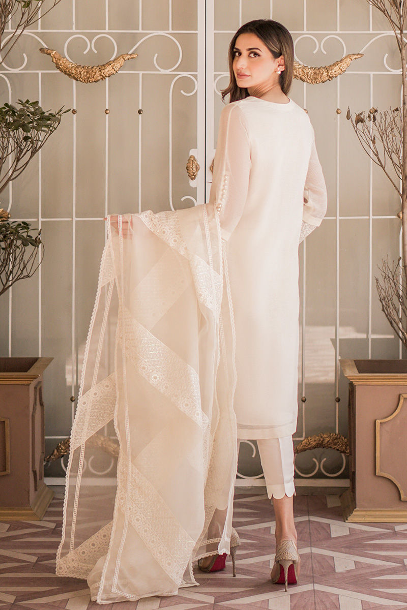 Be a vision of grace in the soft off-white dress. The embroidered neckline and sequin embellished sleeves are just perfect for any daytime event. Pair it with an organza dupatta for a perfect everlasting majestic look.