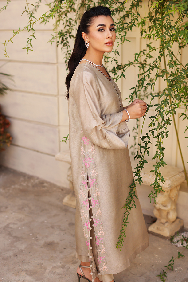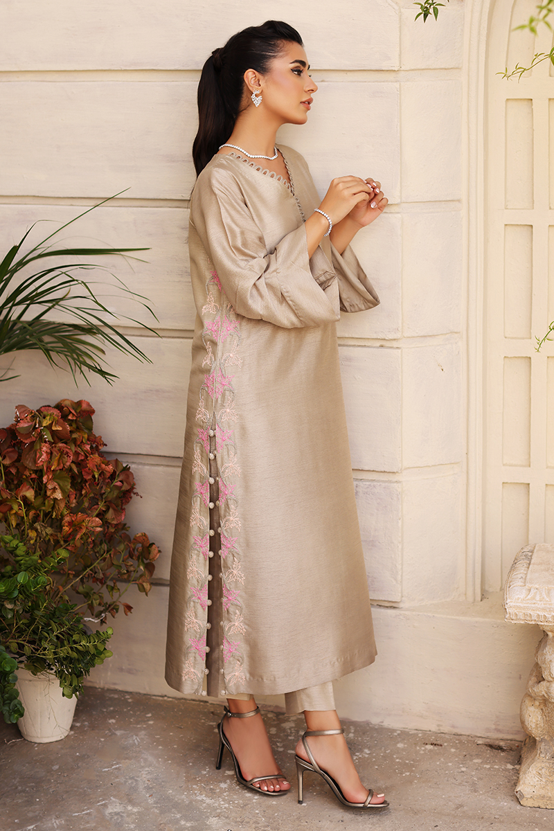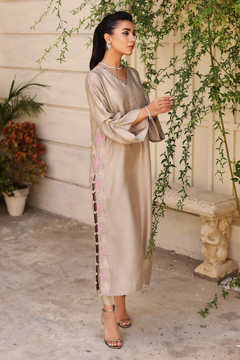 A perfect blend of grey hued canvas with complimenting pink and ivory embroidery on sides. Adding extra beauty with buttons on side slits. Pair it up with pants to complete your vogue look.