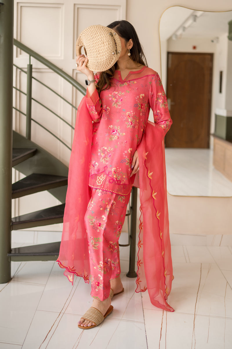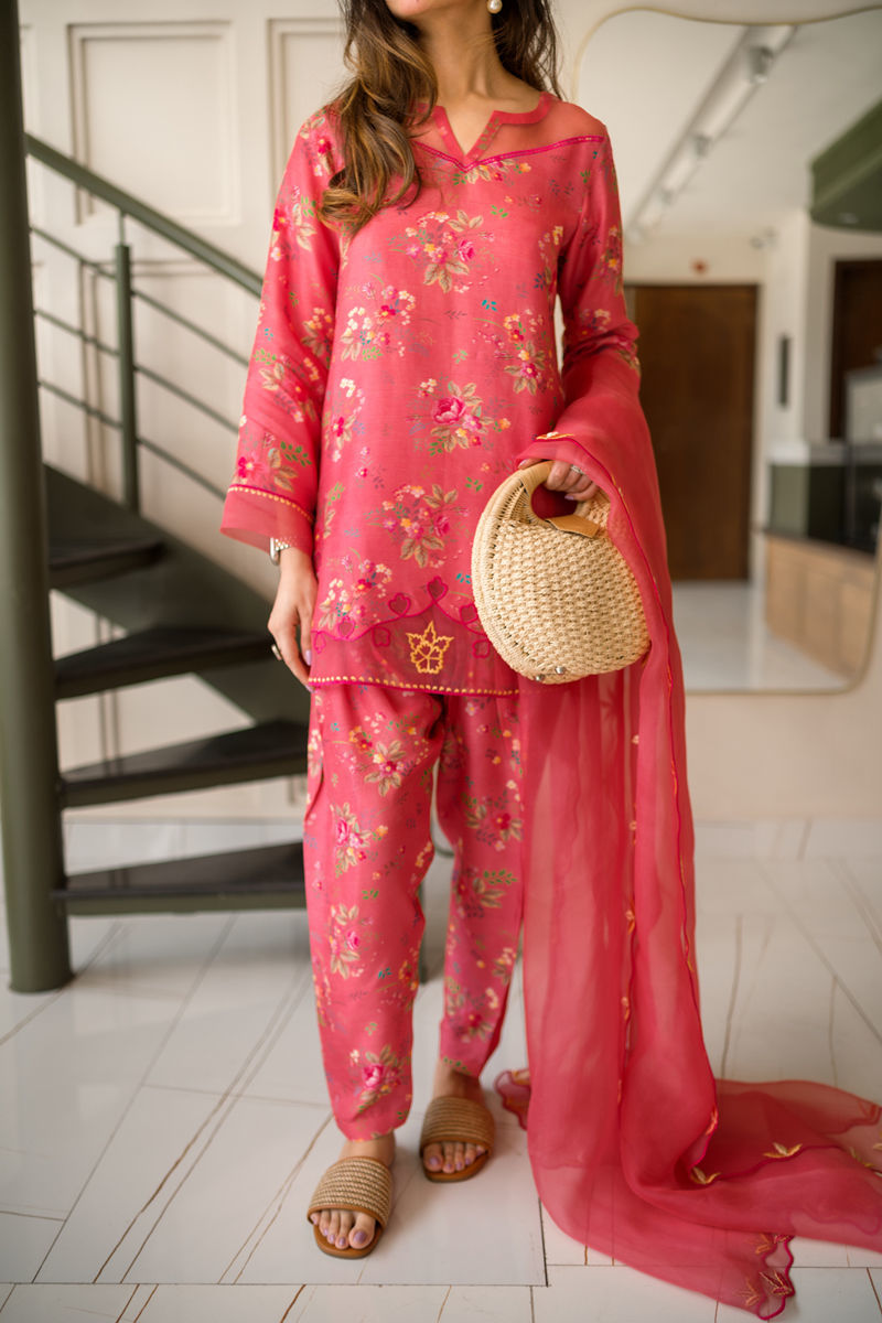 A romantic ode to timeless grace, a dreamy shirt adorned with delicate hand embroidery and soft organza touches along the daman, neckline, and sleeves. Paired with a sleek skinny shalwar and an organza dupatta, lovingly detailed with handwork on all four sides.