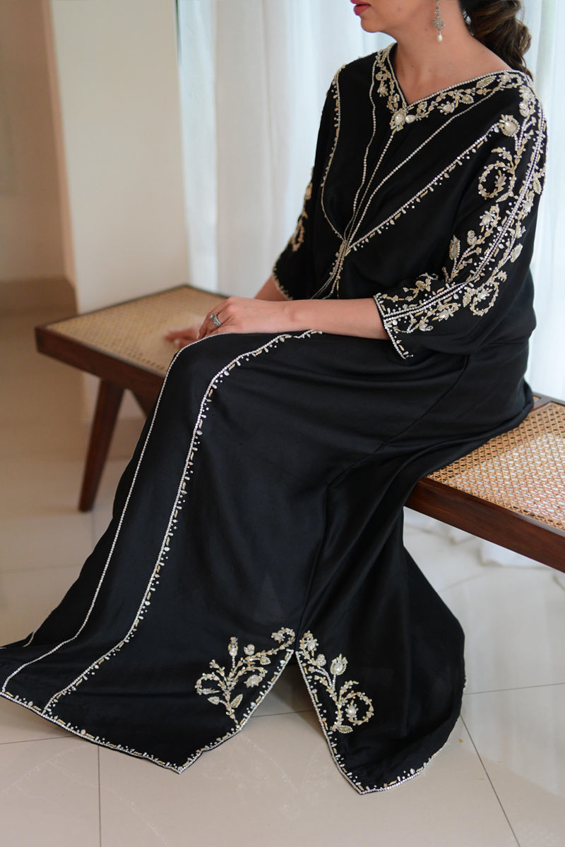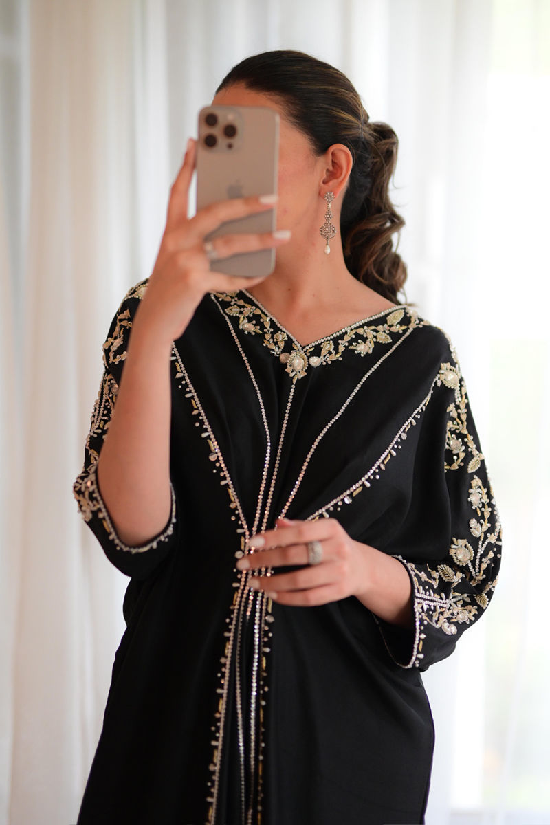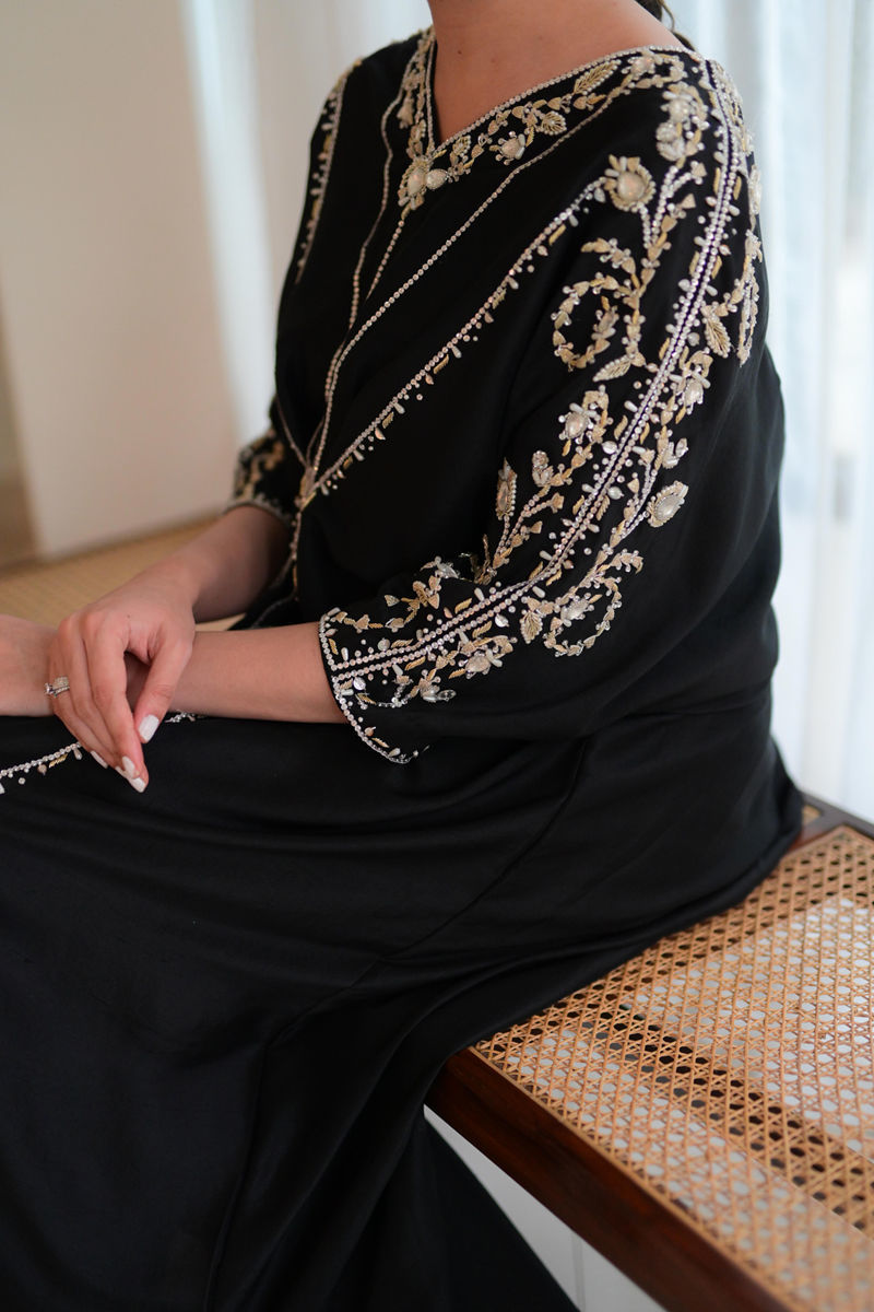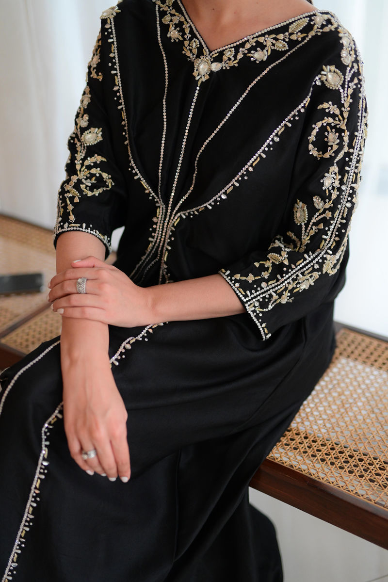Indulge in luxury with this black pure raw silk kaftan, featuring intricate hand-embellished stones, pearls, and Swarovski work adorning the front. Its captivating design exudes opulence and elegance, making it the perfect choice for special occasions that demand a touch of glamour. Step into the limelight and make a statement with this stunning and luxurious kaftan.