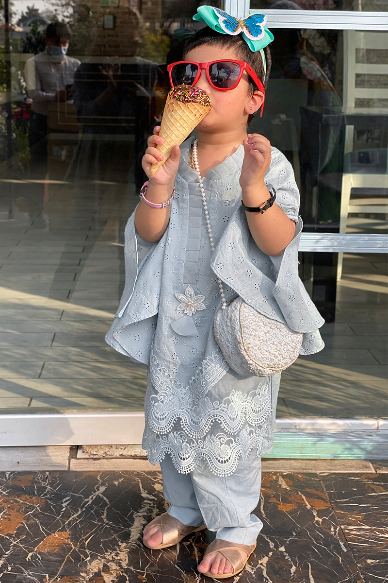 This blue chikan shirt with laces on daman and embroidered tassel on organza frill neckline with plain blue cotton pants.