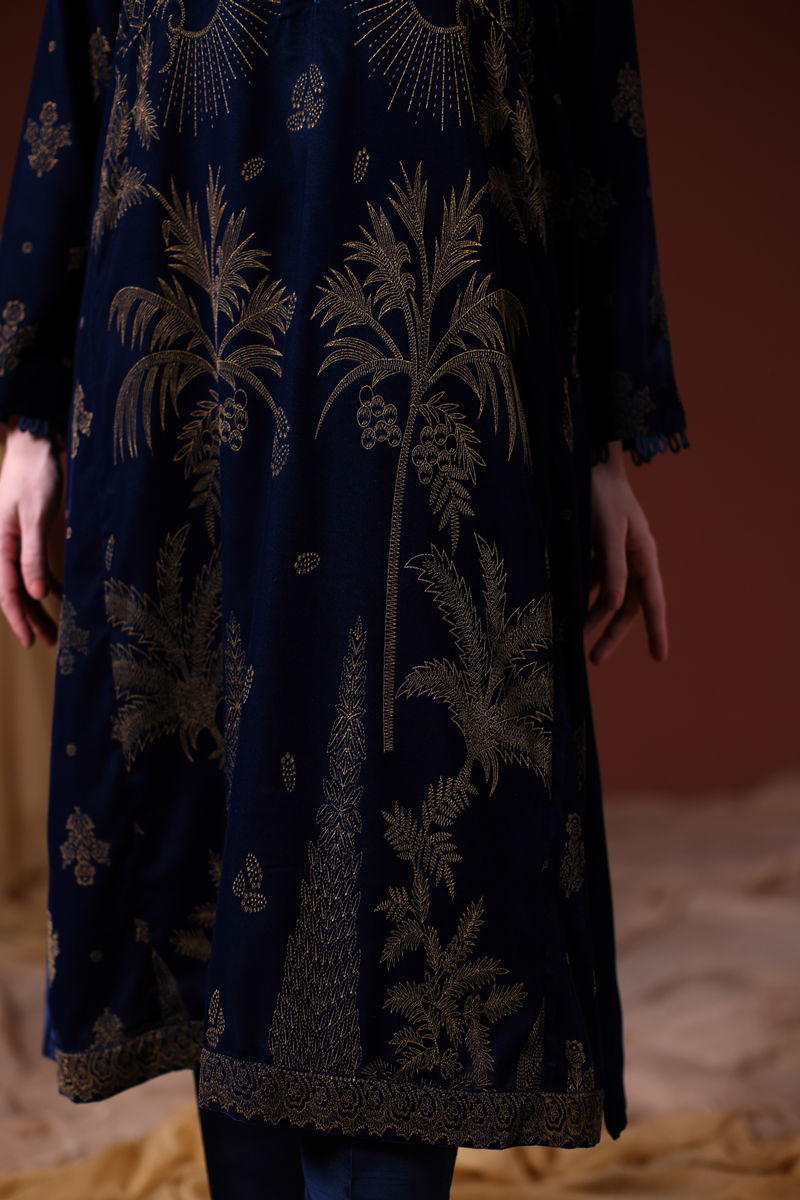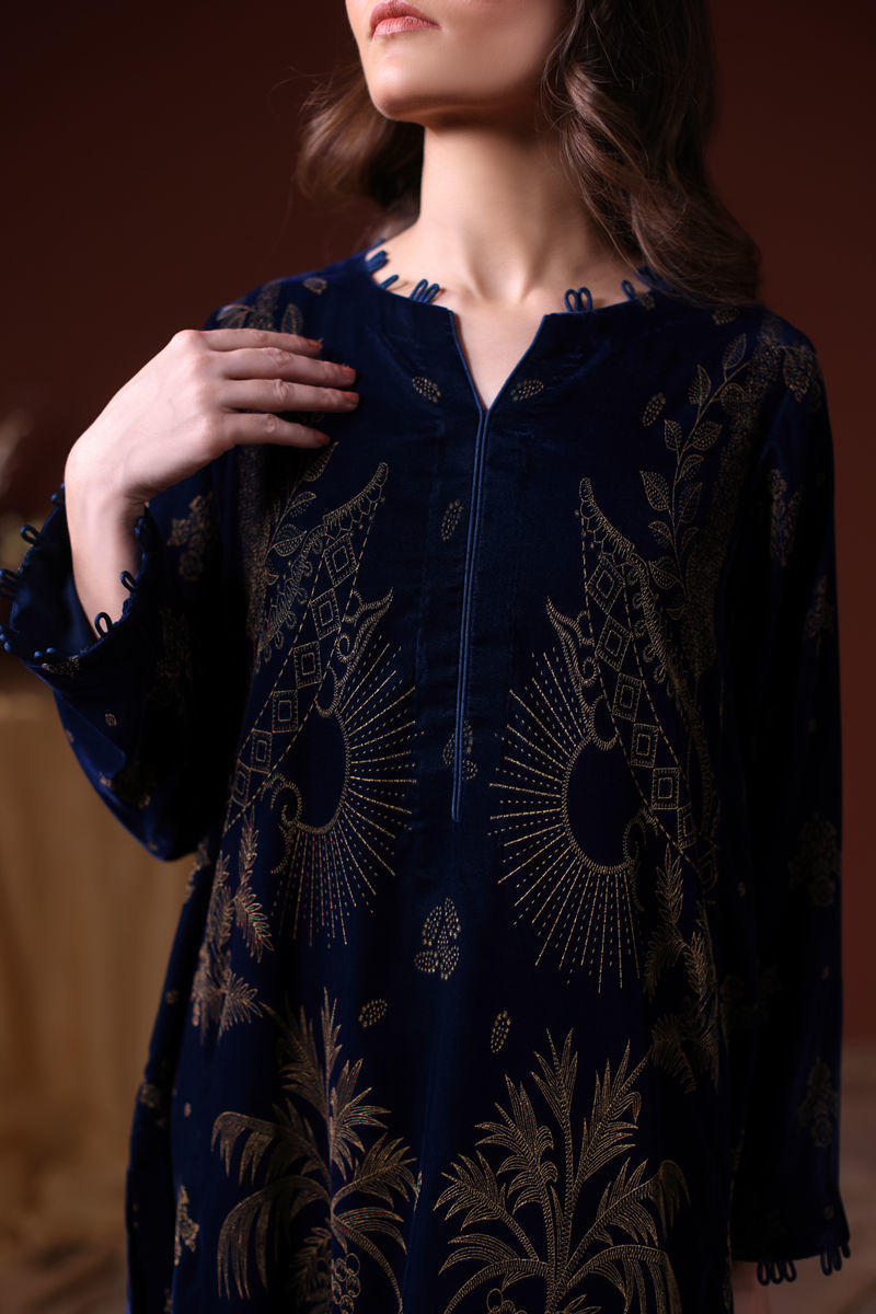 Step into sophistication with our Majesty Blue ensemble, featuring a luxurious velvet shirt that radiates sophistication. This stunning look is complemented by pants, creating a contemporary silhouette. A plain organza dupatta adds a graceful touch, enhancing the overall aesthetic of the dress. The outfit showcases a refined screen print design, adding a modern flair. Perfect for any occasion.