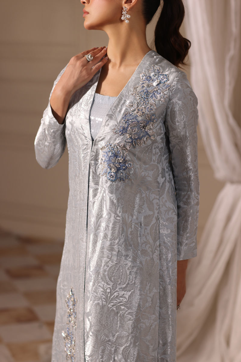 Cleo; an exquisite sky blue and silver long coat, crafted in pure tanchoi, features luxurious hand embellishments of Swarovski crystals, and sequins on the front. Paired with sequined slip and chiffon pants, this coat offers a blend of luxury and elegance, perfect for a statement-making look.