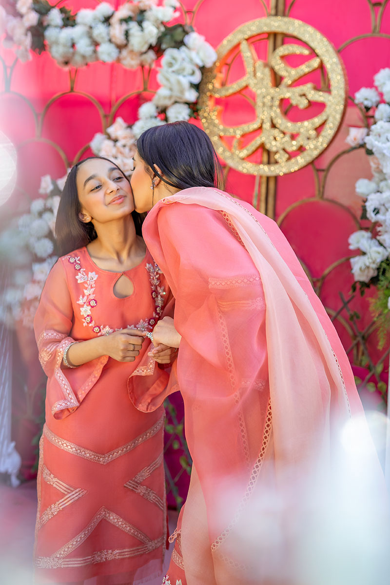 This vibrant coral hue is a Spring favorite.Organza shirt with embroidery and sequins embellisehd neckline with laces finish on sleeves.Perfect outfits to pair with your little one any festive occasion.It comes along with silk slip and korean silk pants.