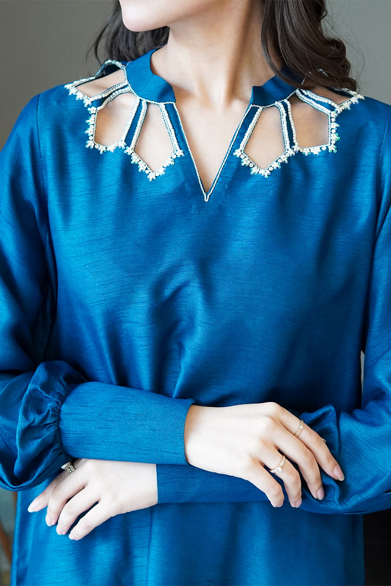 Our beautiful Korean raw silk two piece shirt and pant in dark blue color. It has cuff sleeves and cutwork of swavroski and pearl neckline on it.
