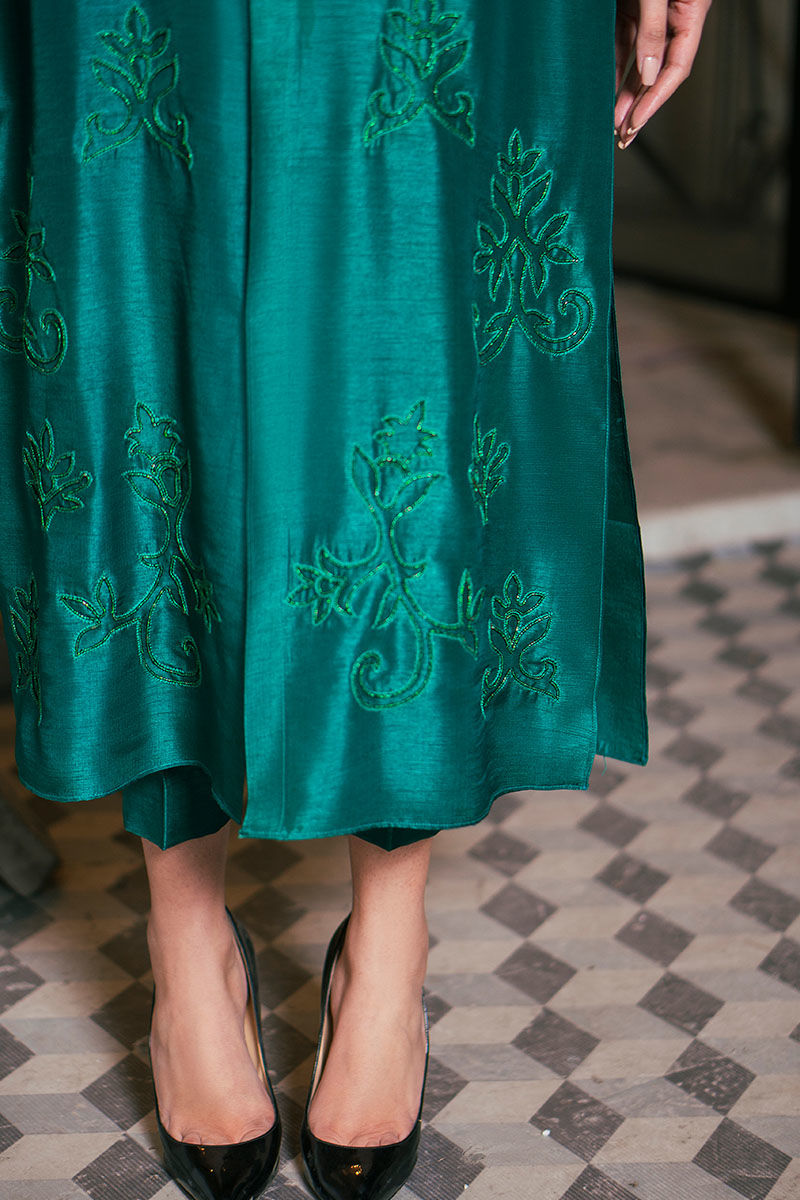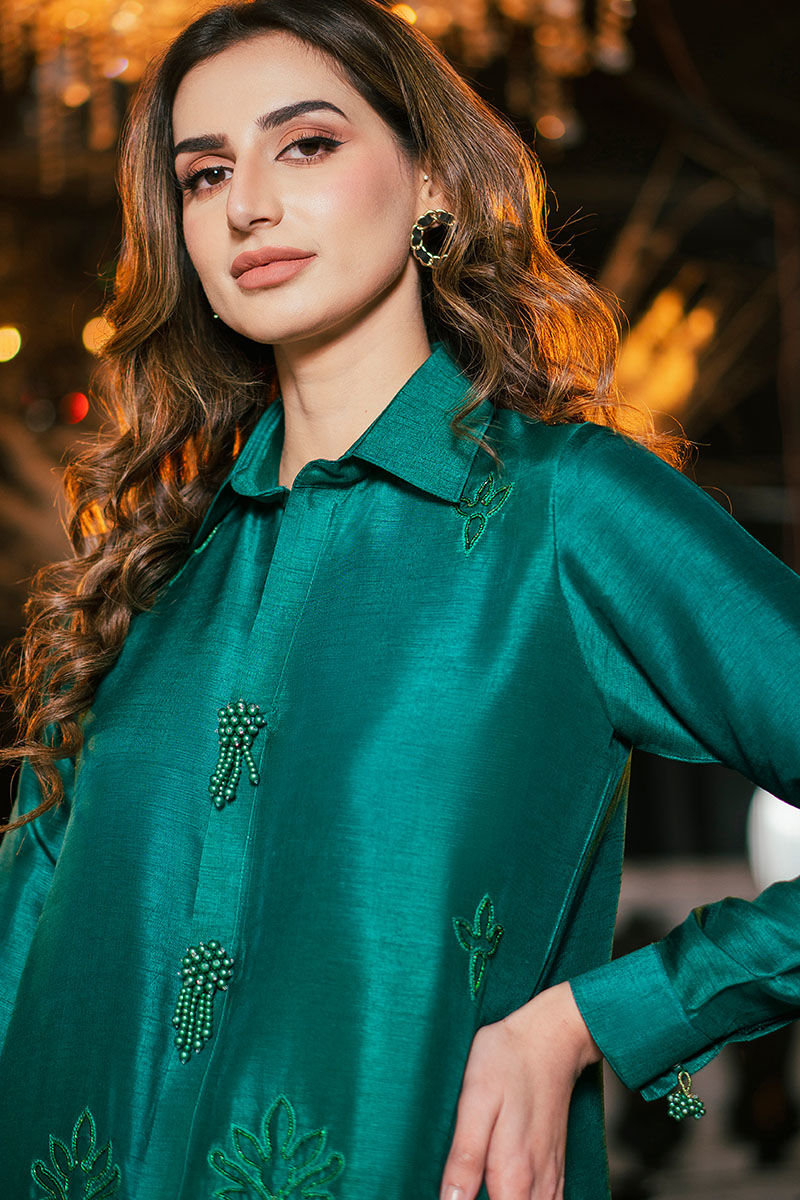 “Darya” is an incredible timeless ensemble featuring a pure raw silk green shirt with hand-embellished beads and pearl booti all over the front along with pearl tassels on the neckline. A perfect ensemble for the statement look to put forward this festive season