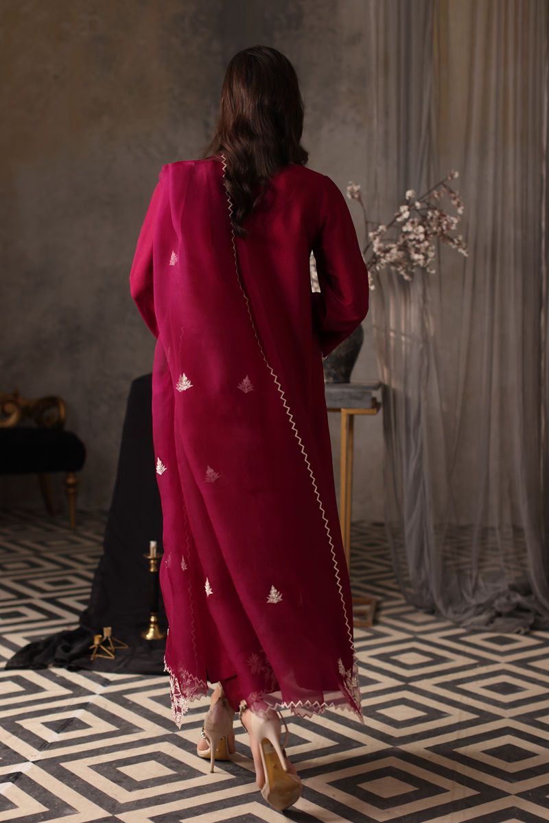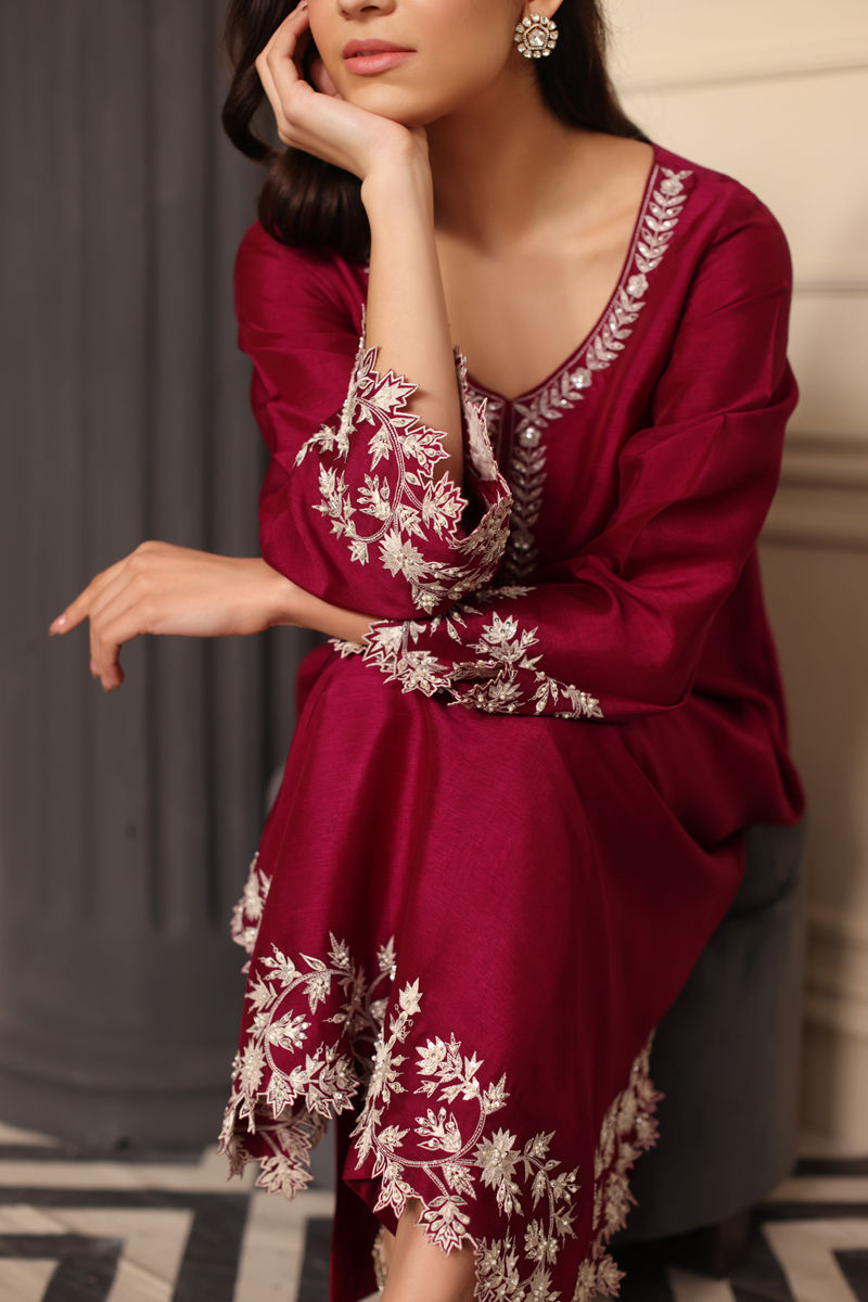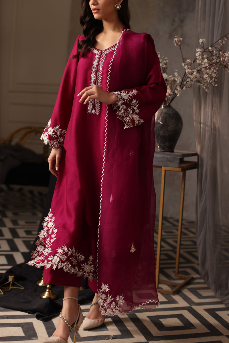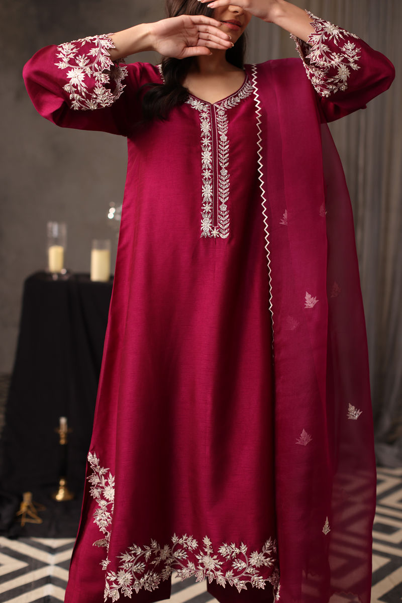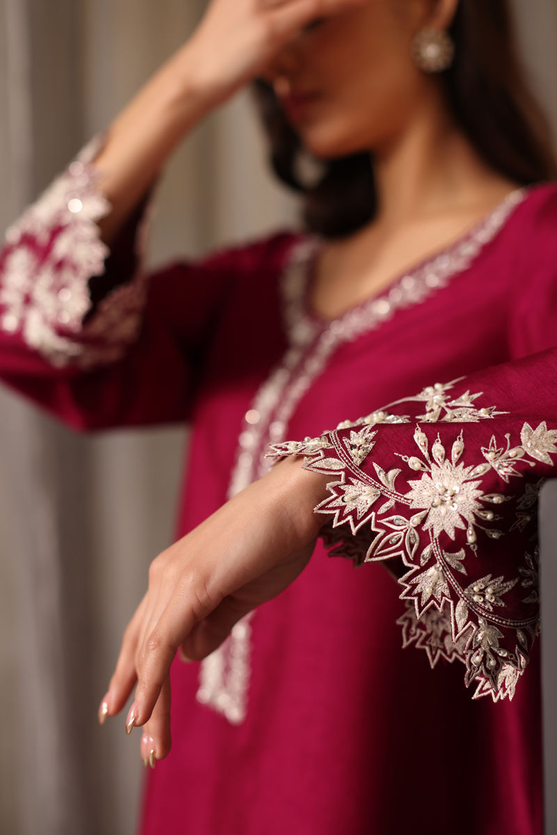 Make a statement with this striking magenta attire, showcasing intricate embroidery and hand-embellished pearls, cutdana, and sequins. The luxurious Korean raw silk shirt features refined details on the neckline, sleeves, and hem, paired effortlessly with sleek silk pants for a look of unparalleled charm. Completing the ensemble is a dupatta adorned with embroidery all over, further elevated by hand-embellished pearls and cutdana, adding an opulent finish.