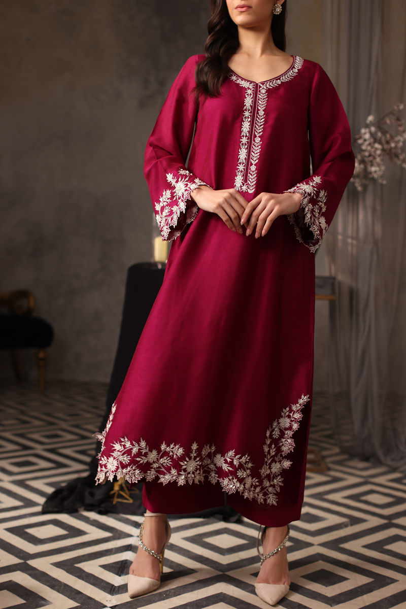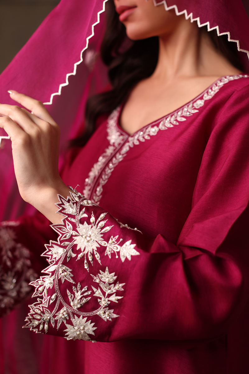 Make a statement with this striking magenta attire, showcasing intricate embroidery and hand-embellished pearls, cutdana, and sequins. The luxurious Korean raw silk shirt features refined details on the neckline, sleeves, and hem, paired effortlessly with sleek silk pants for a look of unparalleled charm. Completing the ensemble is a dupatta adorned with embroidery all over, further elevated by hand-embellished pearls and cutdana, adding an opulent finish.