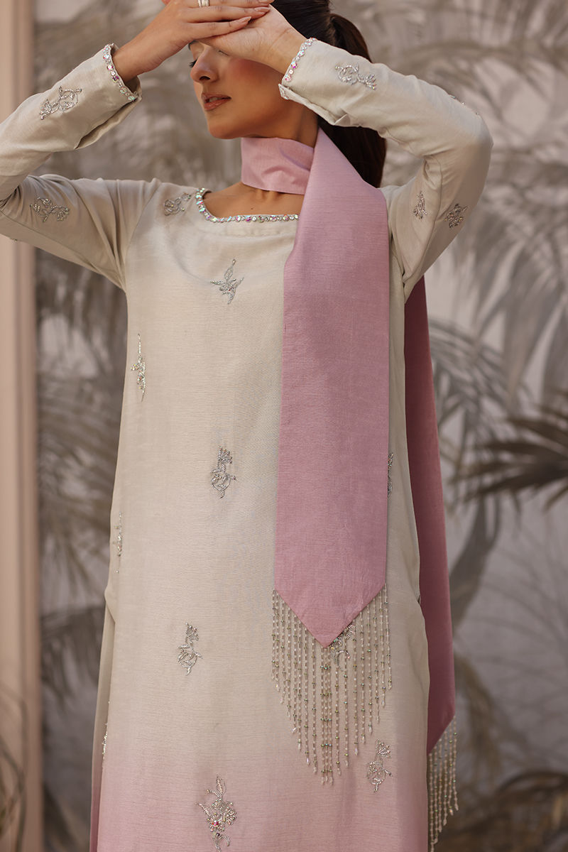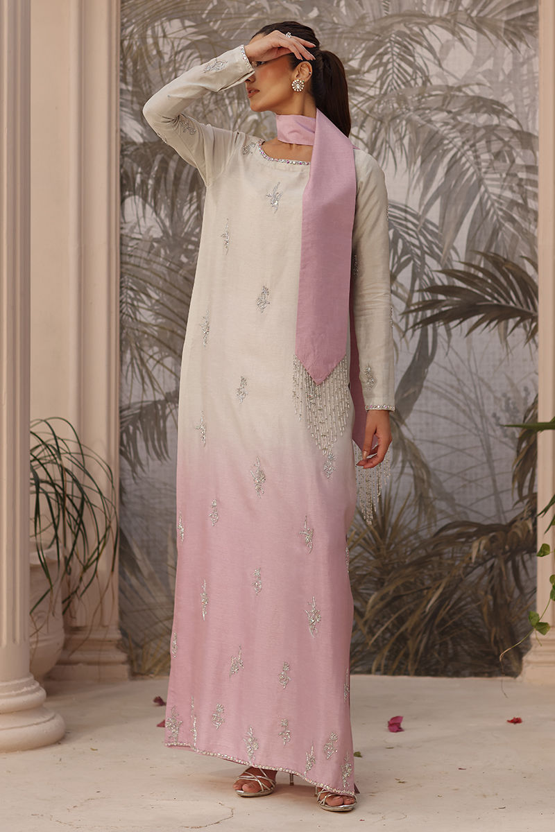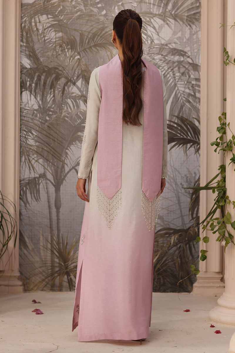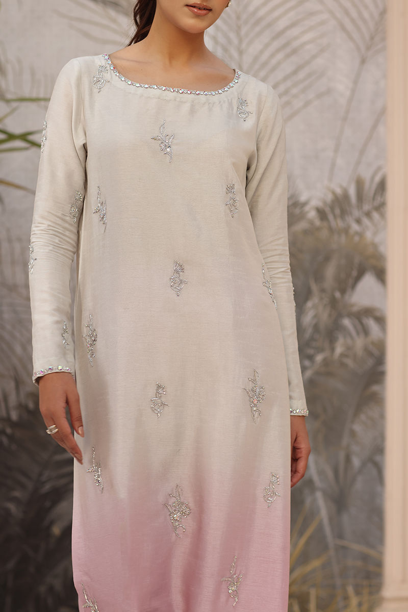 Exude graceful sophistication in this serene lilac ombre ensemble, featuring a finely handworked Korean raw silk shirt paired with a classic raw silk pant. The look is completed with an elegant handworked stole, adding a refined finishing touch. Intricate Swarovski and tilla detailing enhance the design with subtle shimmer, while the elongated silhouette lends effortless elegance -perfect for elevated festive and formal occasions. This shirt length is 55-inch.