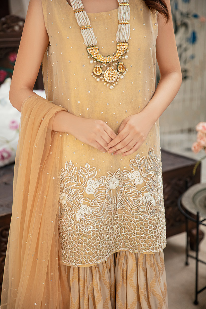 Color: Gold Fabric: Tissue Work Details: Embelished Daaman - Swarovski and Pearls Work