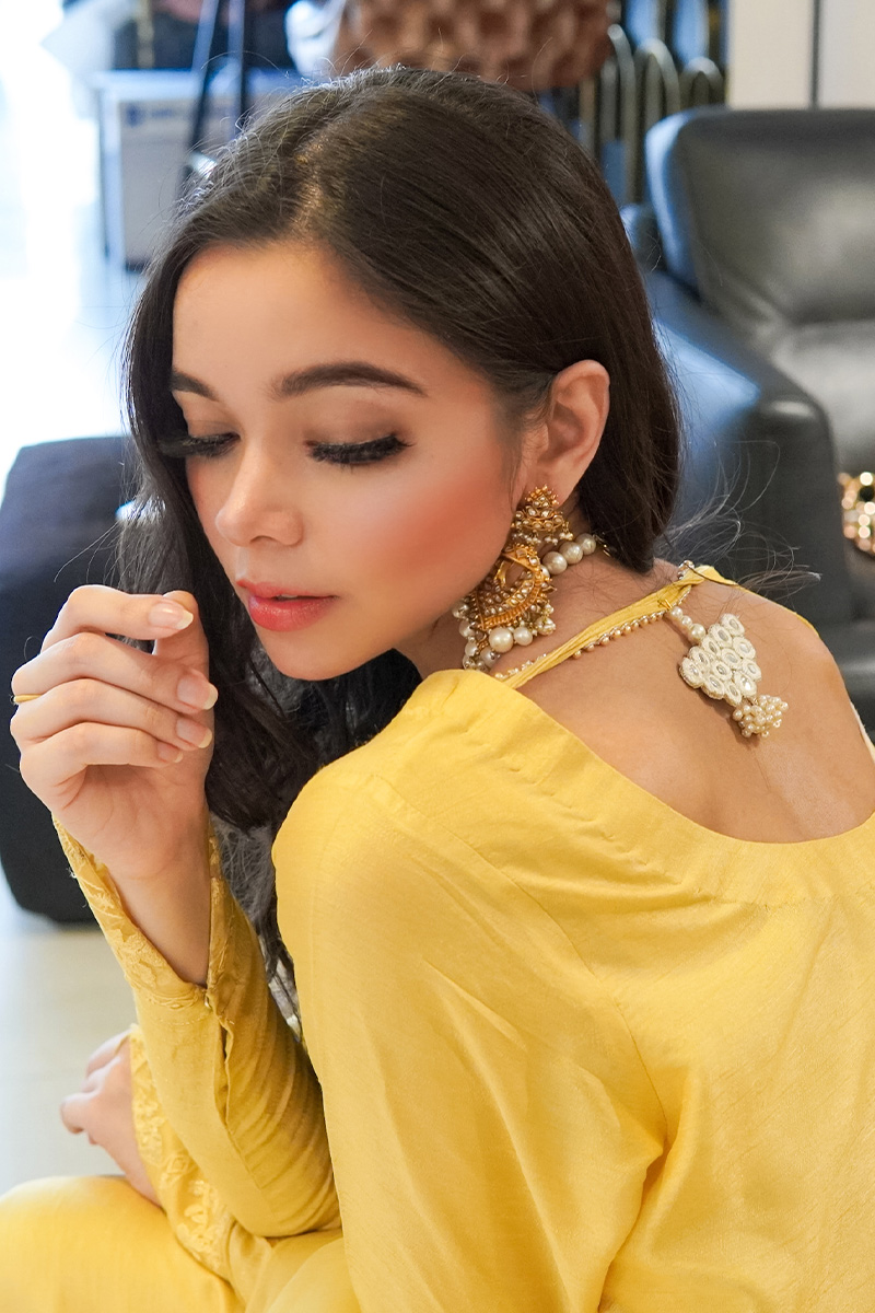 Our Signature golden yellow plain shirt with hand embellished pearl and zari daman. It has Embroidered sleeve finish, organza dupatta with embroidered laces all over it and Pearl tussel on the back. It is paired with Plain korean silk pants.