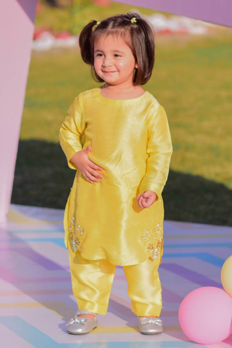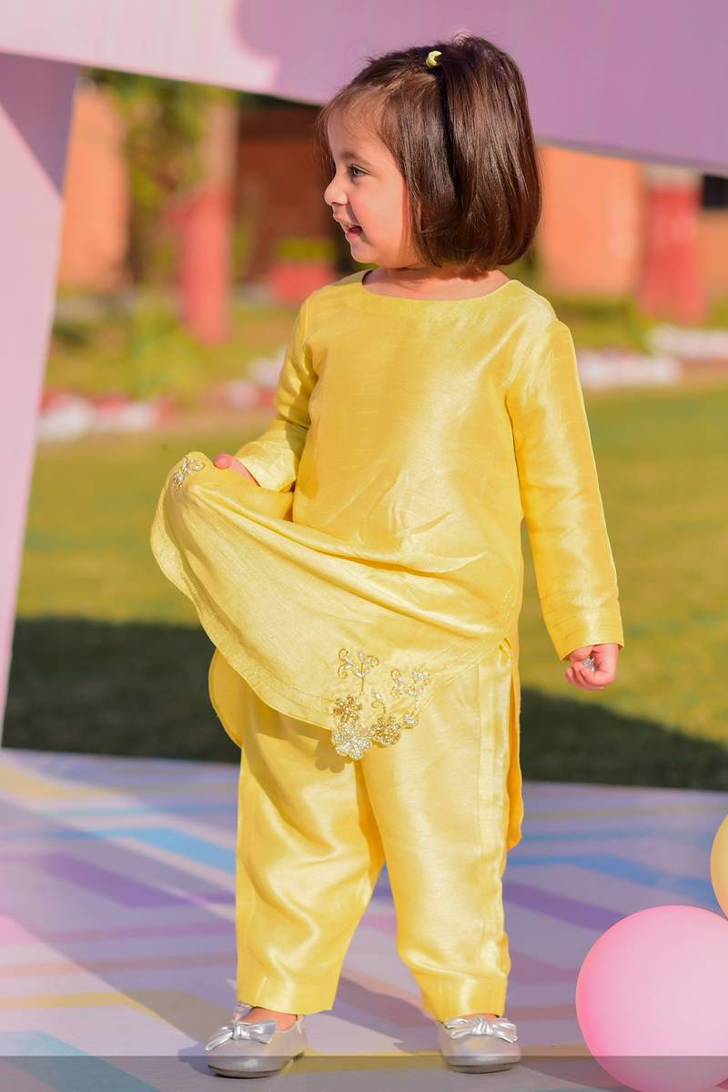 Our signature golden yellow plain shirt has zari lines on sleeves ! It is paired with plain korean raw silk pants