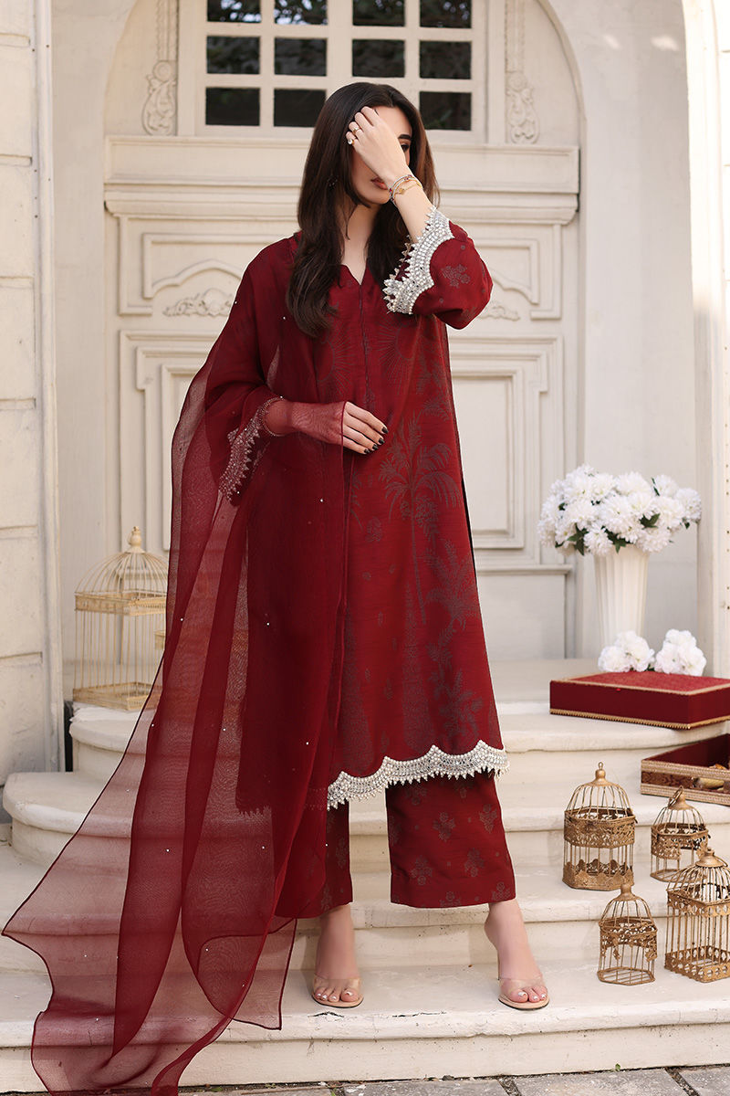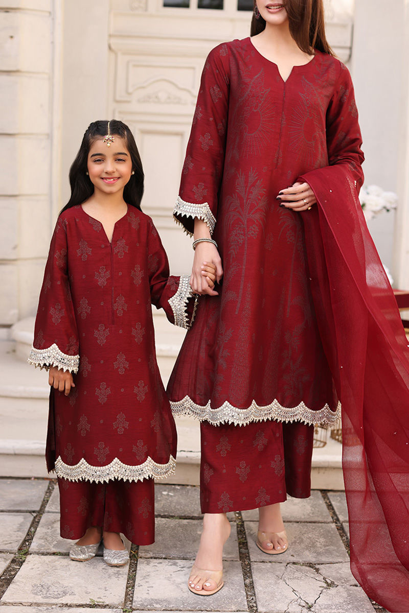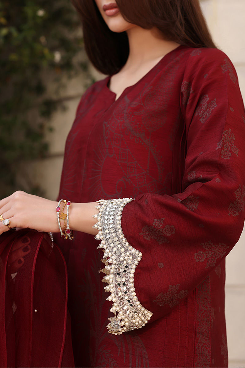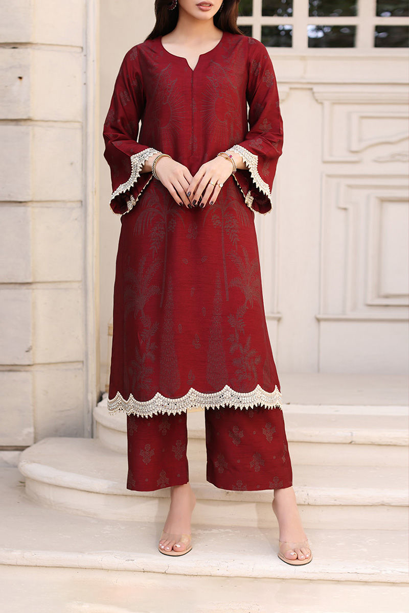 Color: Maroon & Ivory Fabric: Korean Raw Silk & Organza Net Work Details: Screen Print, Mirror Work & Pearls