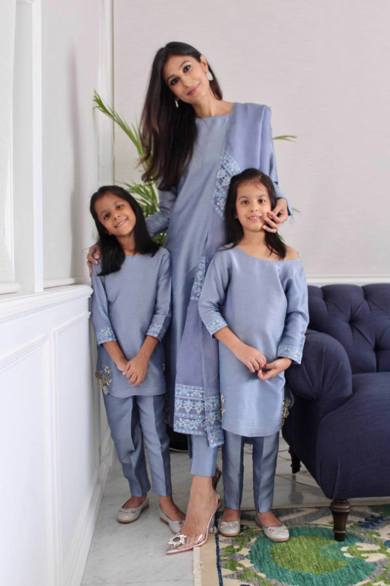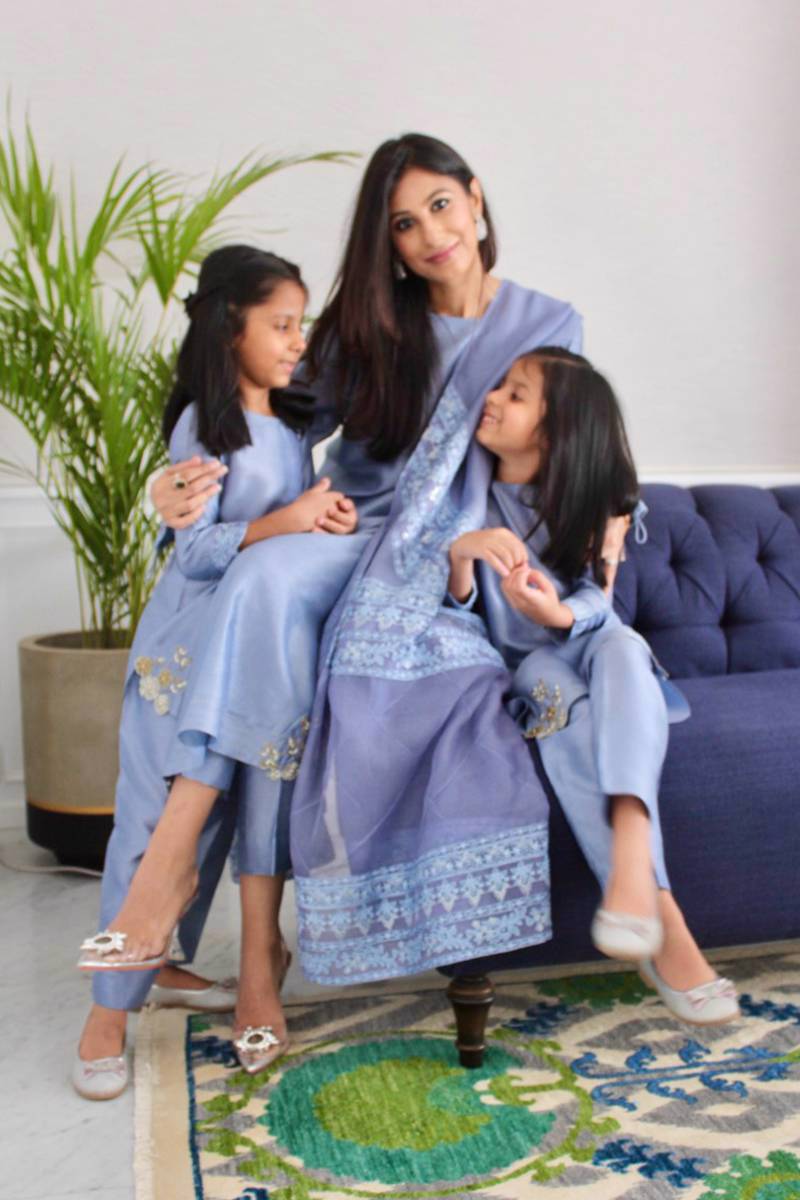 Our signature ice blue plain shirt with hand embellished pearl and zari daman. It has embroidered sleeve finish. It is paired with plain korean silk pants.