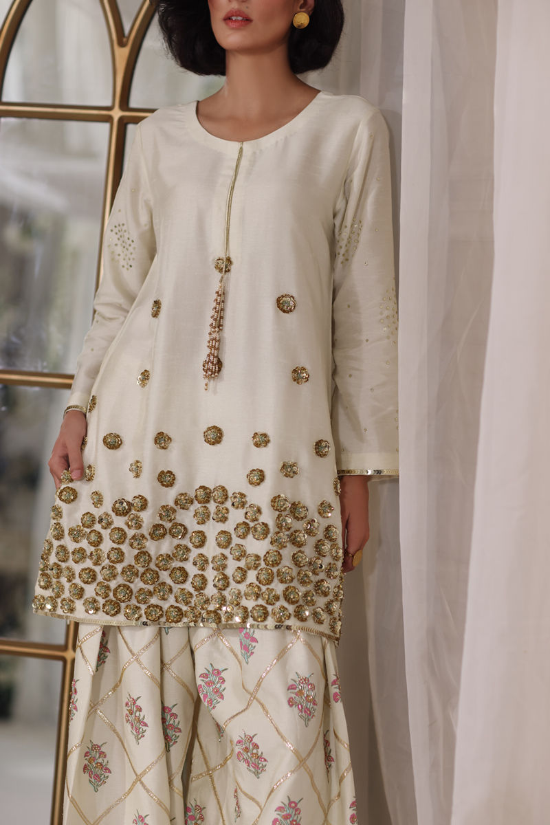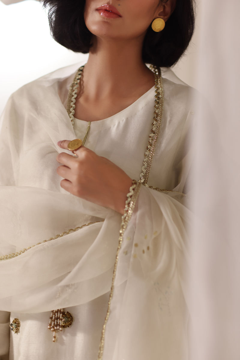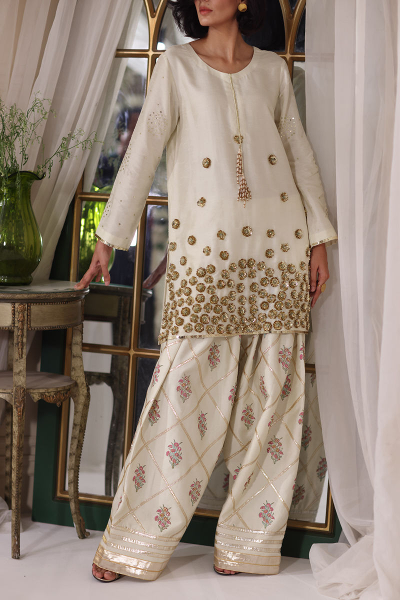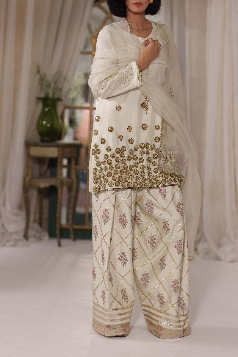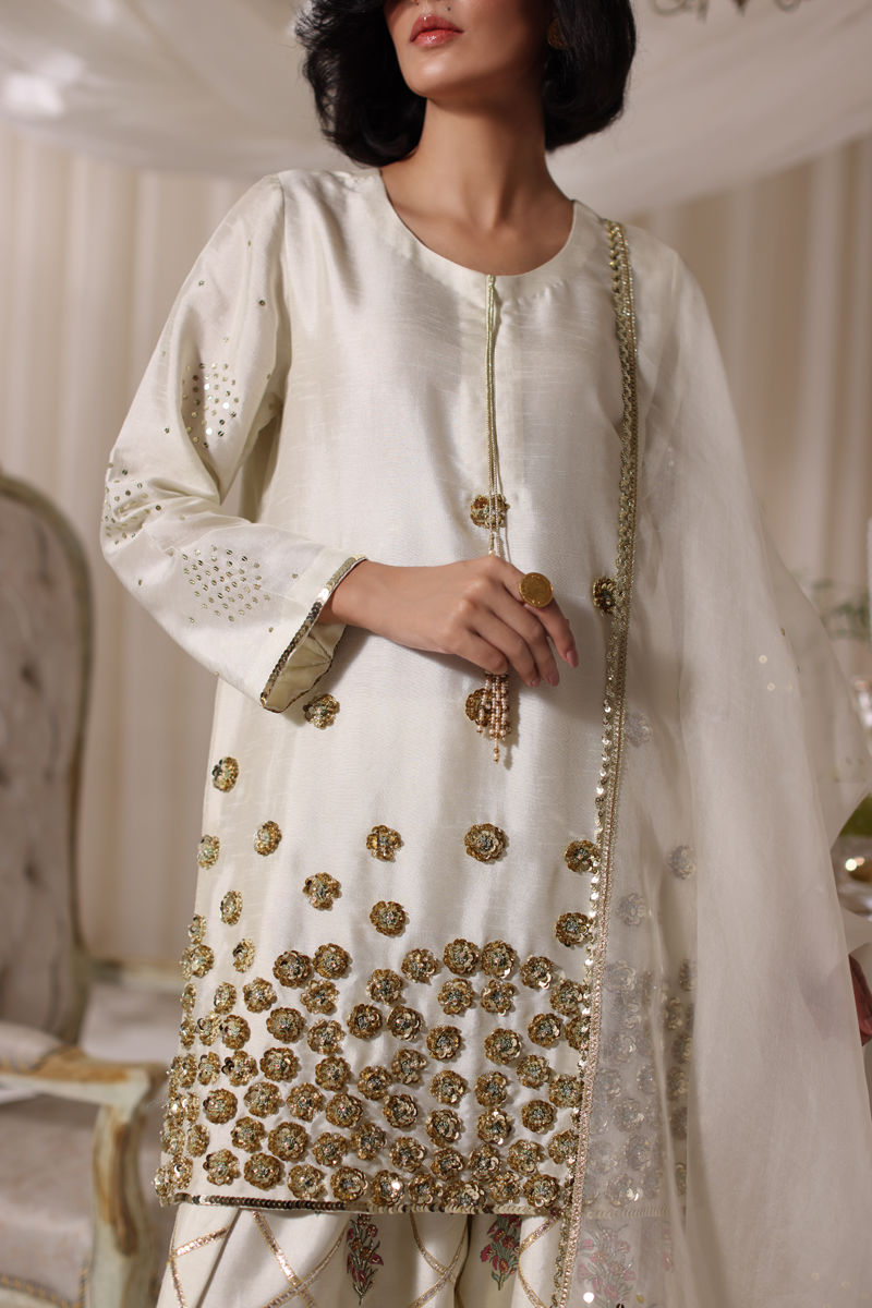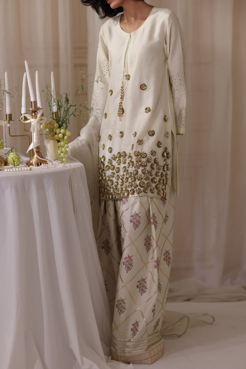 An ode to timeless elegance, this silk shirt and shalwar is adorned with delicate block prints, kissed with hand-embellished nakshi, pearls, Swarovski, and cut dana, while the shirt shimmers softly with sequins, pearls, and resham. The shalwar is block printed with handwork glimmers with dainty gota patti, adding a touch of tradition to its refined silhouette. Paired with an ethereal organza dupatta, finished with lace, sequins, and hand-embellished sheesha work, this ensemble is a poetic harmony of craftsmanship and romance.