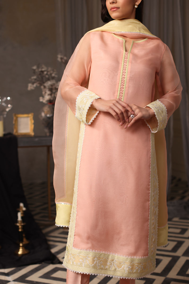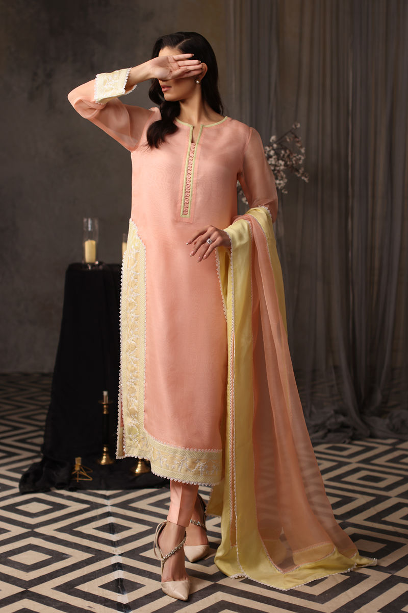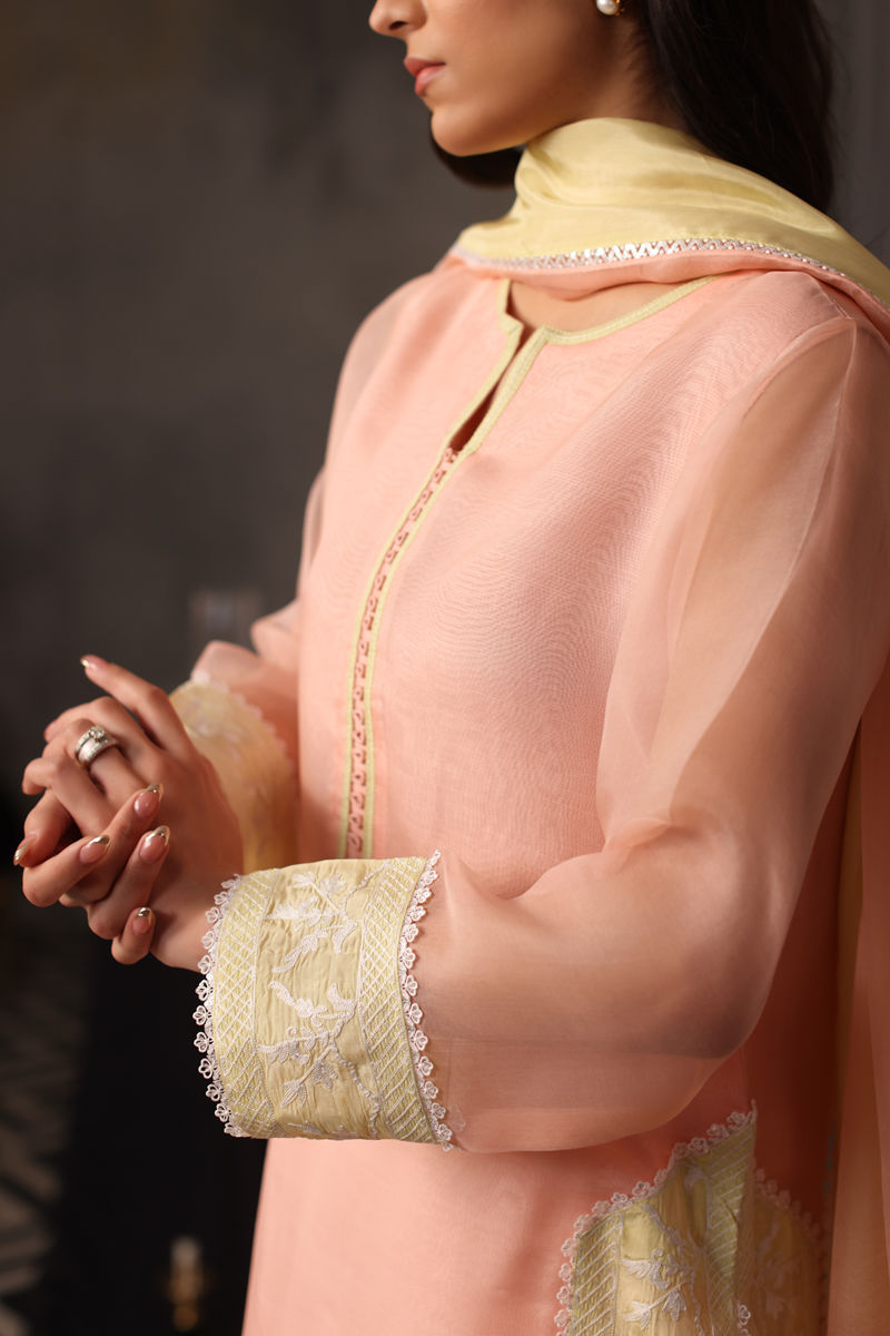 This enchanting peach organza ensemble captures the essence of grace and delicacy with aari embroidery elaborating the hem and slit, while the loop-detailed neckline and lace accents bring a modern flair. Paired with plain Korean silk pants, it’s a testament to timeless artistry and understated elegance. The outfit is complemented by an organza dupatta with intricate lace detailing and a medium silk finish, enhancing its delicate appeal.