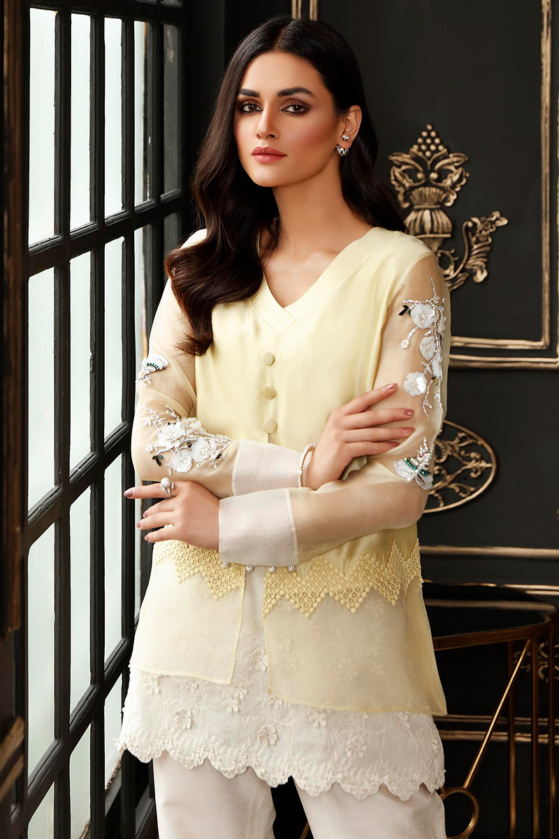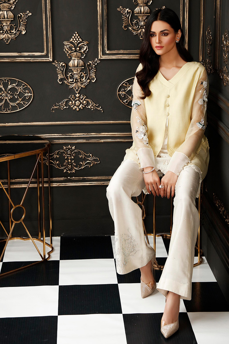 Embodying the freshness of spring and the boldness of summer, this lemon yellow organza jacket with organza lace borders and 3D hand-worked with sequins, pearls and Swarovski sleeves is perfect for those spring festivities. It is paired with an off white raw silk boot cut pants with an intricate motif. It comes with an off-white undershirt.