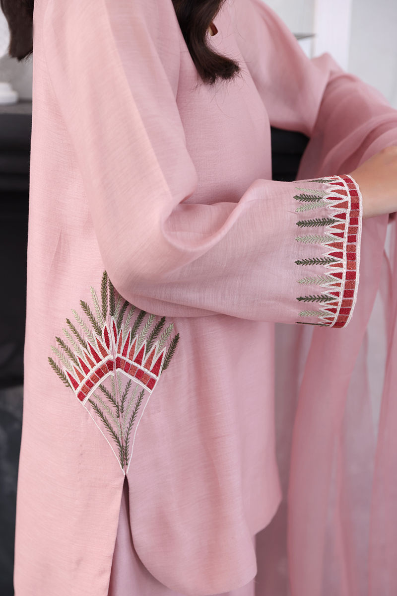 Indulge in pure luxury with an exquisite pure organza silk ensemble featuring delicate embroidery on the shirt sides and sleeves, creating an ethereal and sophisticated aesthetic. The ensemble is perfectly complemented by cotton pants adorned with matching embroidery, ensuring a harmonious balance of elegance and comfort. Embrace timeless style with this meticulously crafted combination that seamlessly blends opulence and simplicity. The front length of the shirt is 31 inches and back length is 34 inches. The pants length is 36 inches.