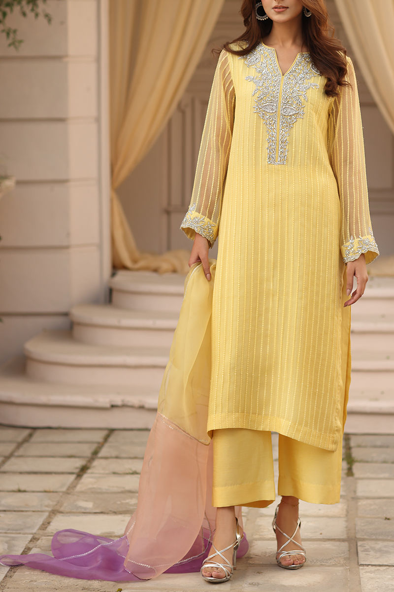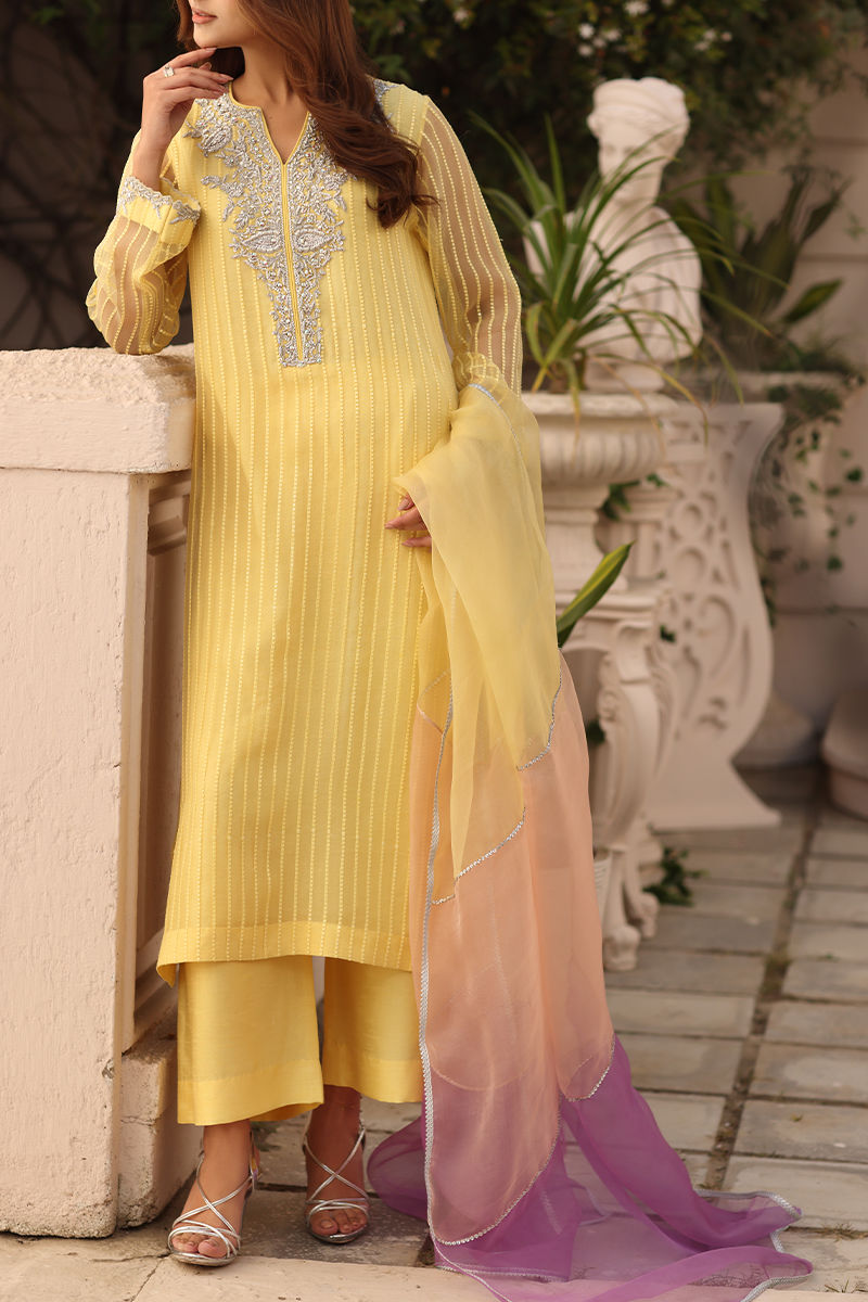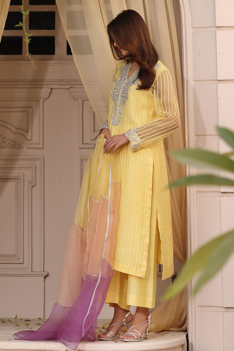 Radiate elegance in this yellow ensemble featuring a self-embroidered organza shirt and dupatta, beautifully enhanced with intricate handwork. The neckline is adorned with delicate beeti and dabka detailing, complemented by Swarovski and dabka embellishments that add a subtle festive sparkle. Paired with a structured raw silk pant, this design blends timeless craftsmanship with refined sophistication- perfect for elevated festive wear.
