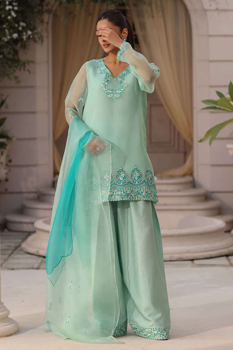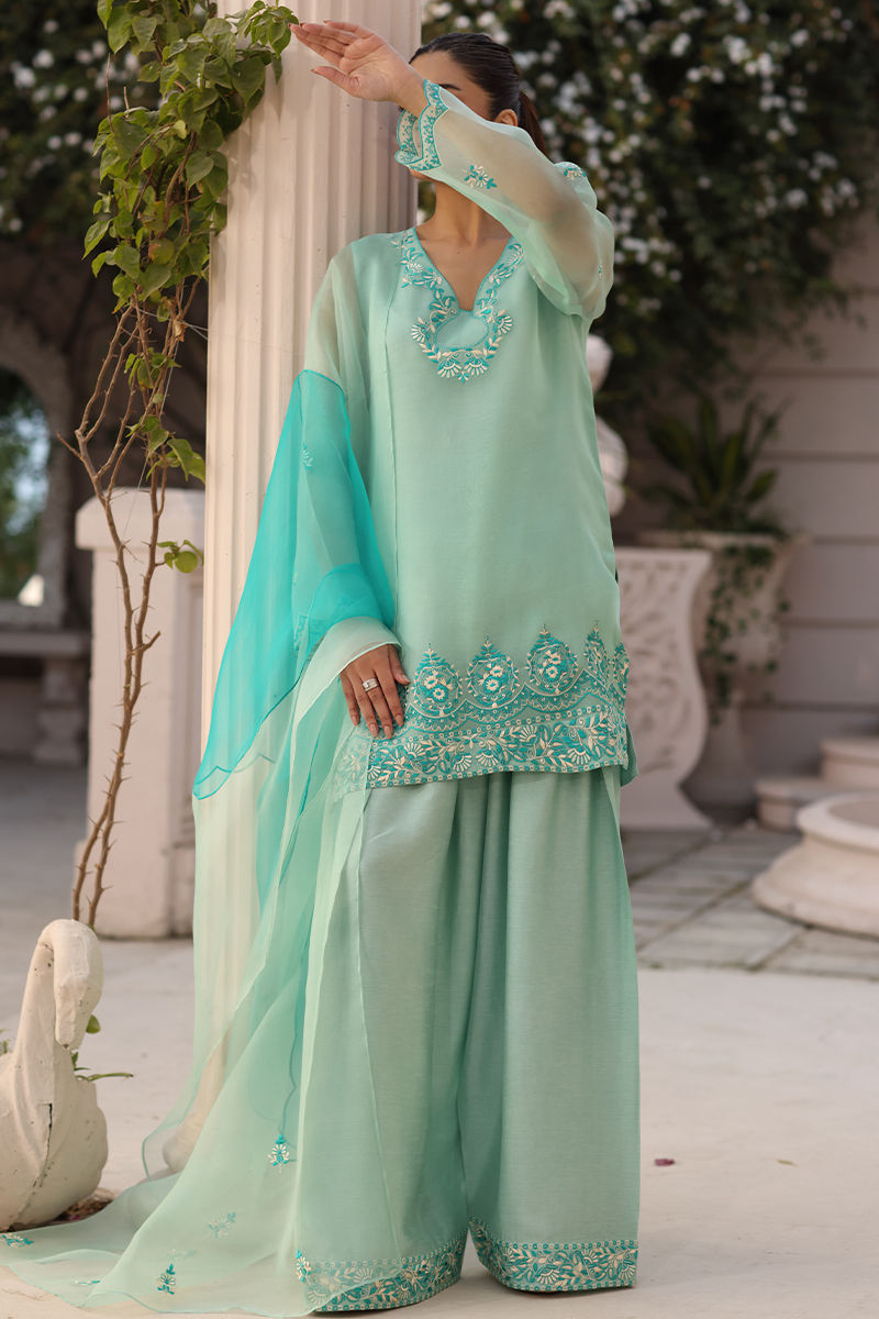 Refresh your festive look with this elegant mint green ensemble, featuring a delicately embroidered organza shirt and dupatta that exude airy sophistication. The outfit is paired with a finely embroidered raw silk shalwar, adding richness and balance to the soft silhouette. Designed with a graceful fall and timeless appeal, this ensemble is perfect for refined daytime festivities and celebratory gatherings. This shirt length is 33-inch and shalwar length is 42-inch.