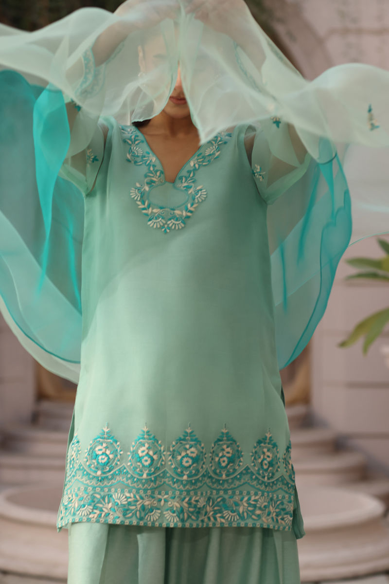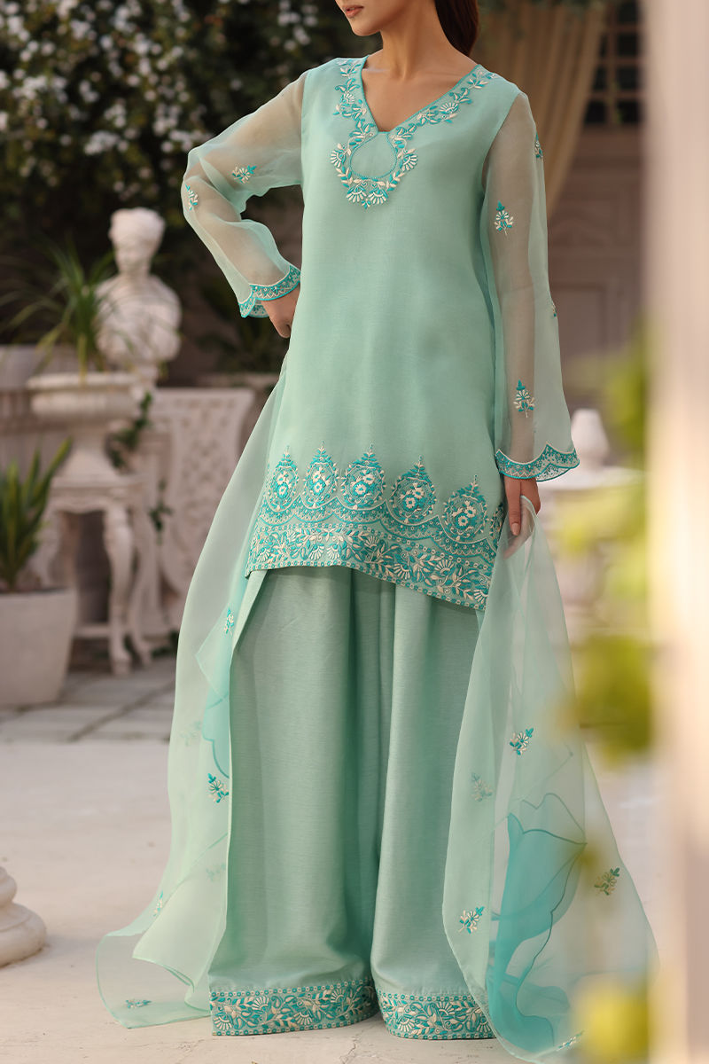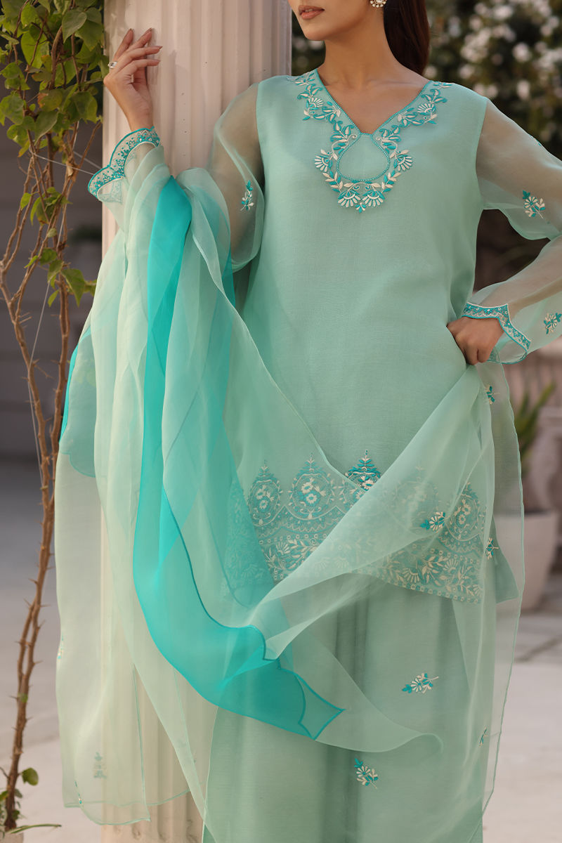 Color: Mint Green Fabric: Shirt: Organza, Shalwar: Raw Silk Work Details: Embroidered