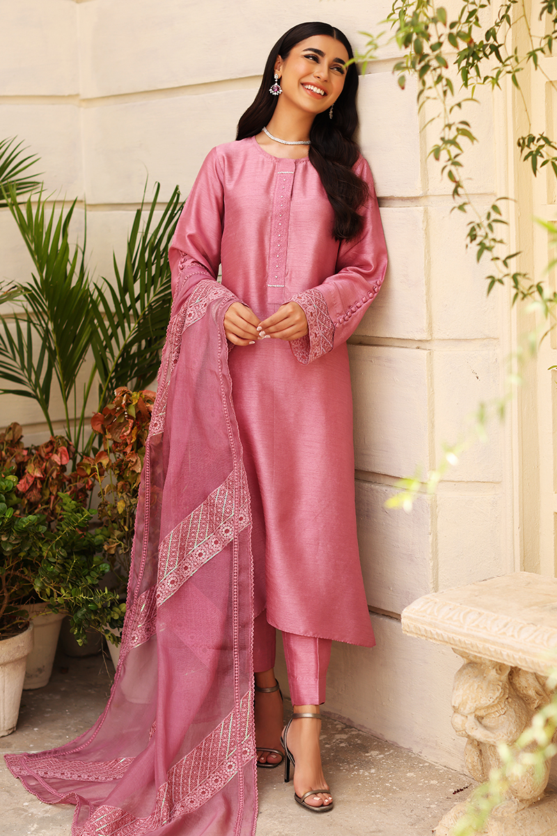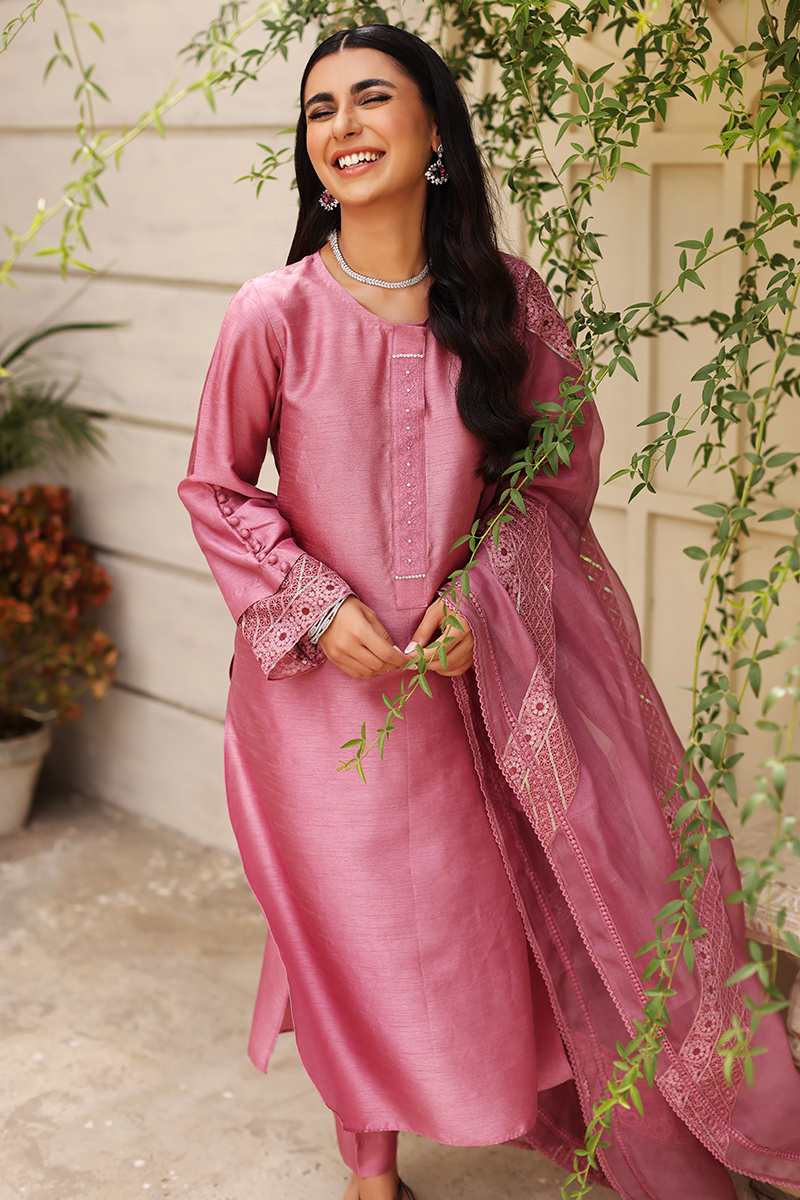 Color: Falsa Pink Fabric: Shirt and Pants: Korean Silk, Dupatta: Organza Work Details: Embellishment