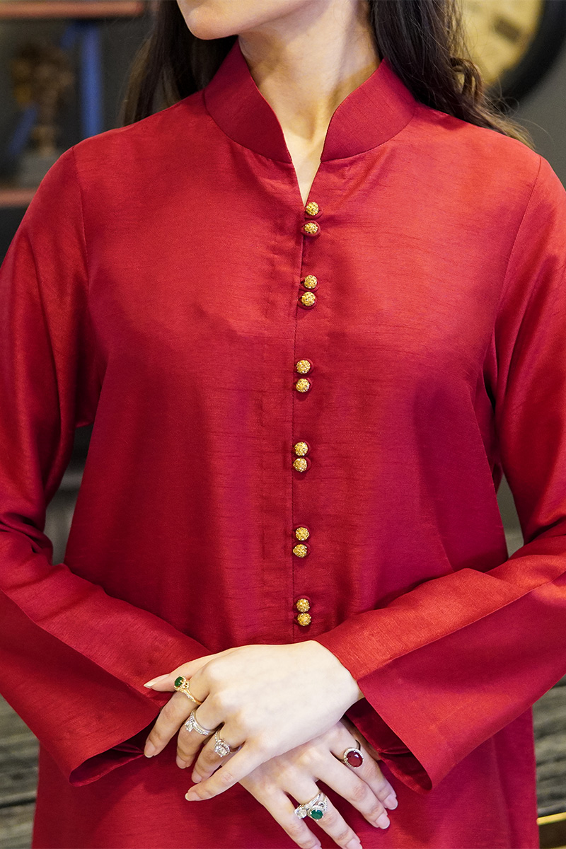Our majestic maroon korean raw silk shirt is beautified with zari-embrodered cutwork. Buttons on the neckline add elegance to the whole outfit. Pair it up with straight pants to complete the look.