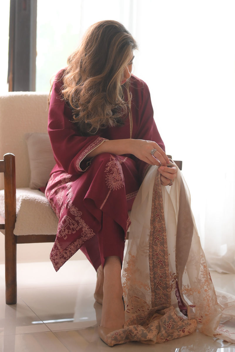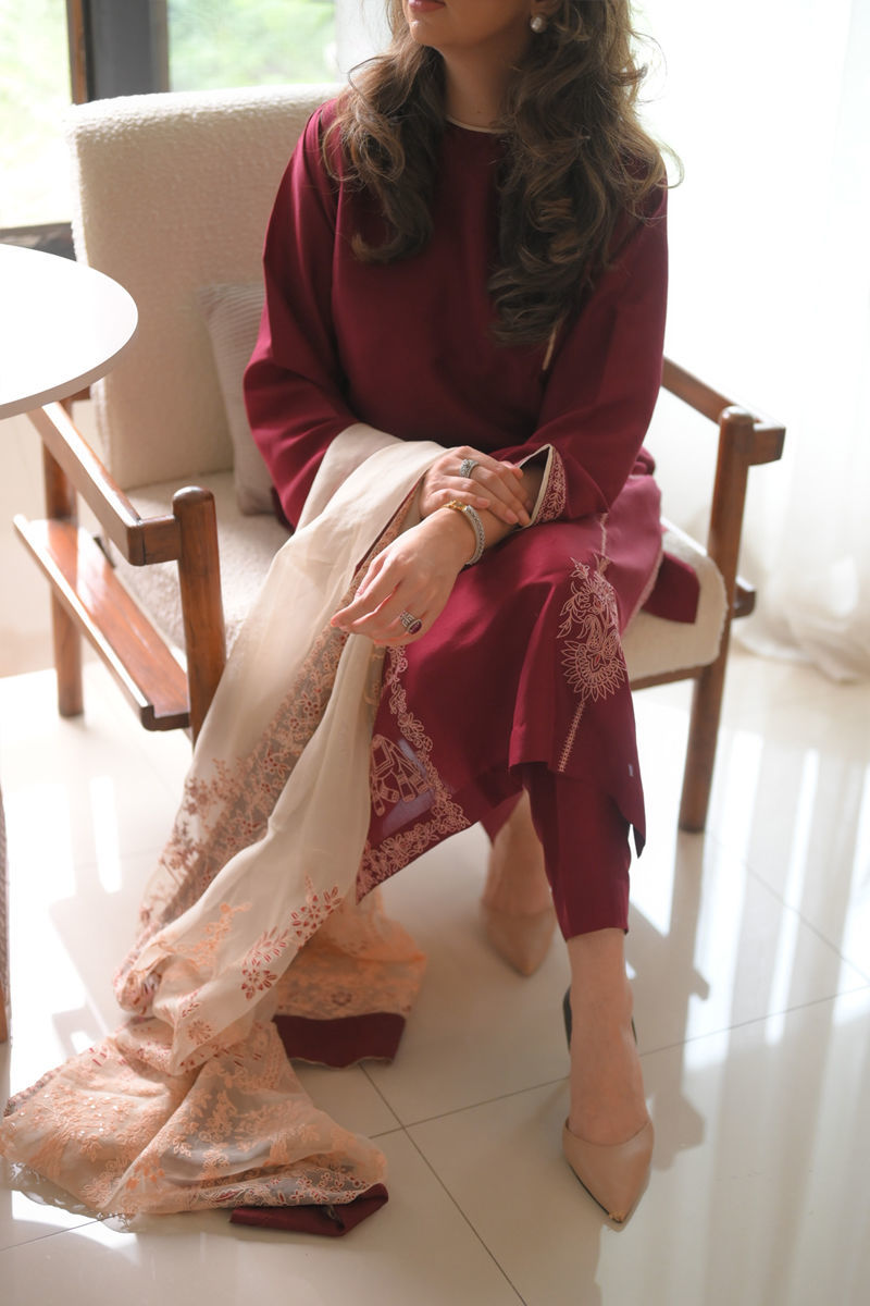 Indulge in elegance with our maroon pure raw silk shirt, featuring delicate embroidery on the daman and sleeves. Complemented by sleek pure raw silk pants, this outfit is designed for sophistication and style. The look is finished with a beautifully embroidered organza dupatta, making it perfect for any festive or formal event.