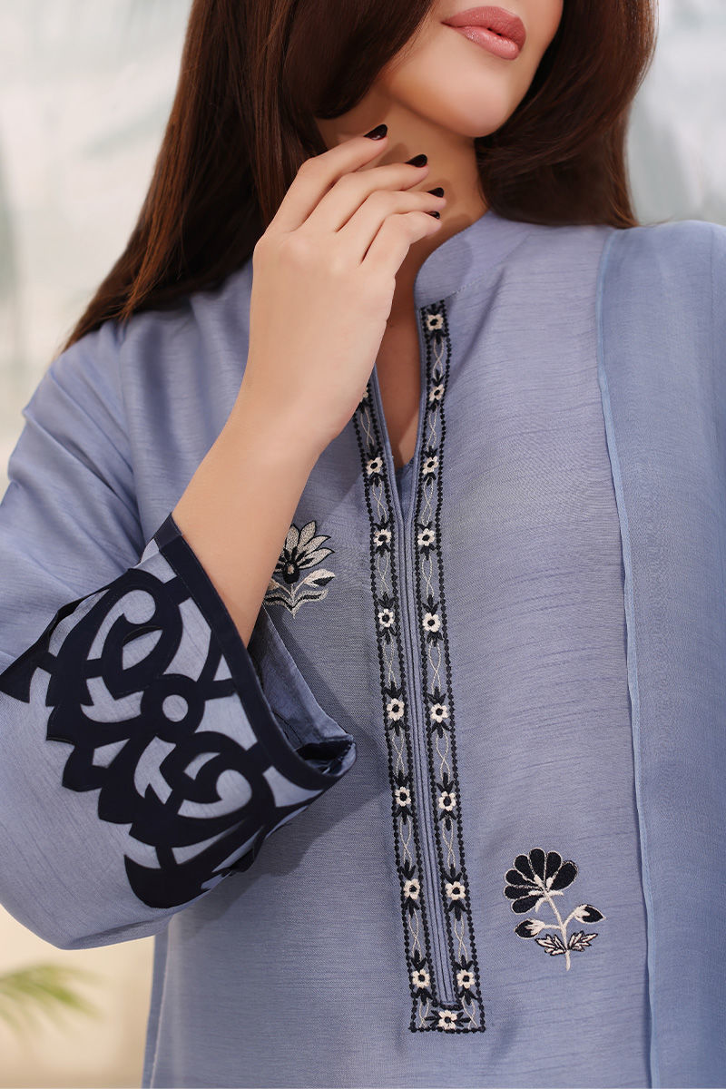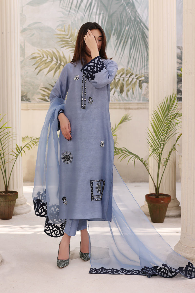 Color: Steel Blue, Ivory & Navy Blue Fabric: Korean Raw Silk & Organza Work Details: Embroidery & Applique