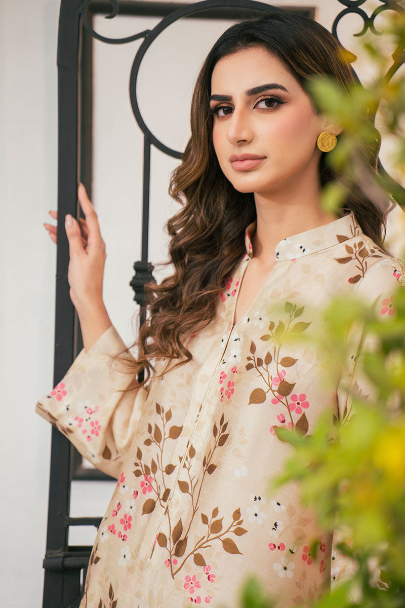"Merle" a statement shirt features refreshing floral digital print and delicate lace details along the sleeve. Pair it with a matching printed shalwar to complete the look. A perfect outfit rendered in a muted shade of beige for that subtle chic look.