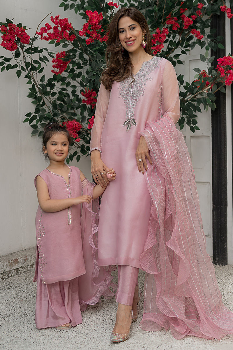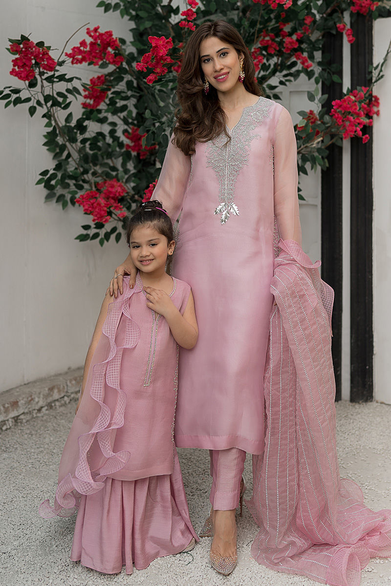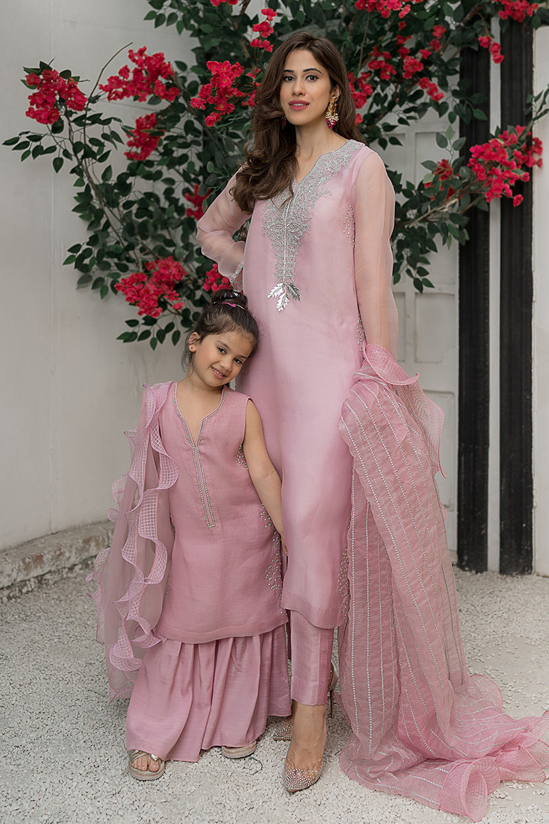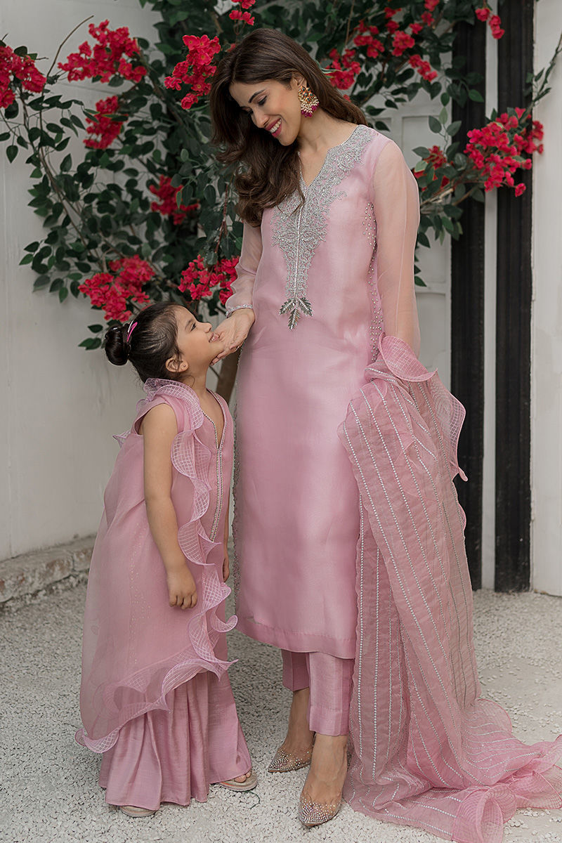A perfect organza shirt with crystal on neckline, along with korean raw silk sharara and organza dupatta. The dupatta has frill finishing on borders that soothes the eye with its unmatched vibrancy and grace.