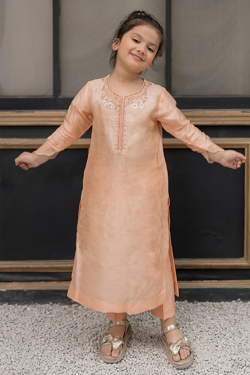 Color: Peach Fabric: Korean Raw Silk, Pants: Raw silk Work Details: Embroidery, Pearls and Swavroski
