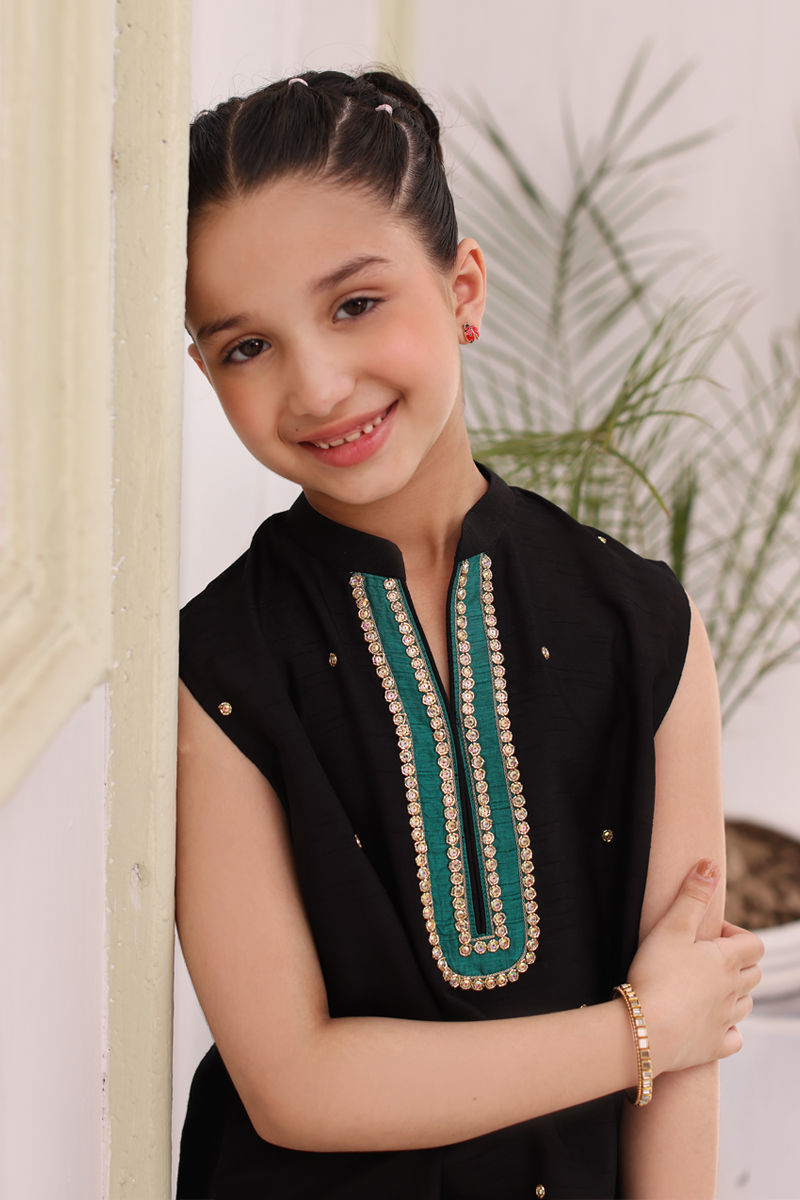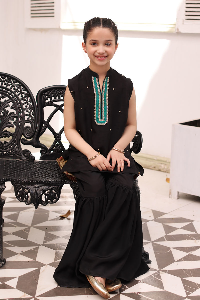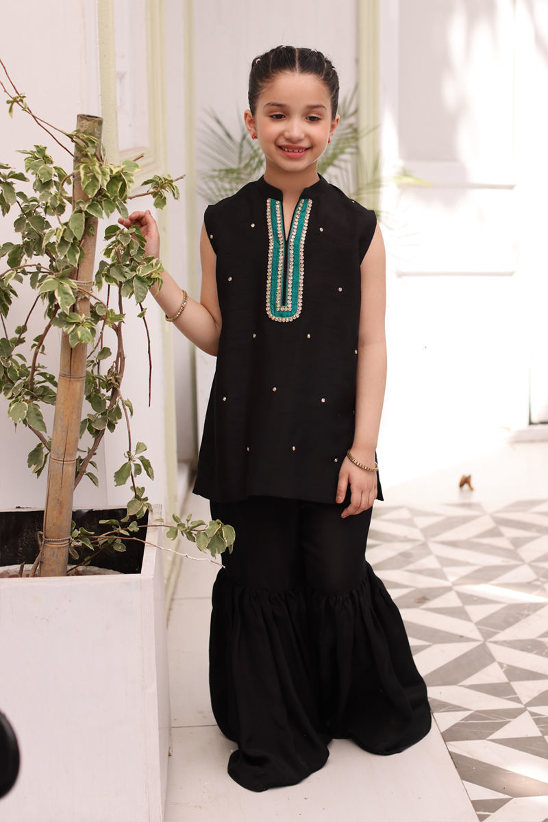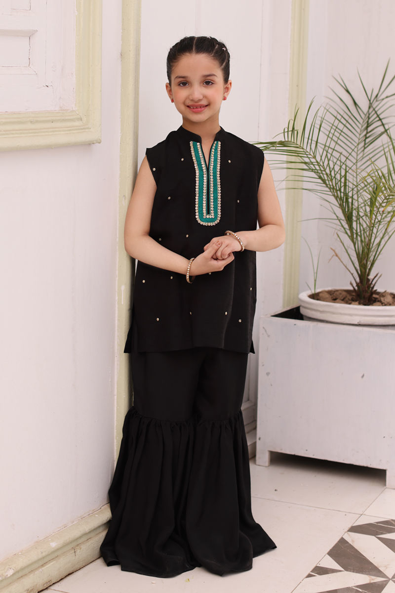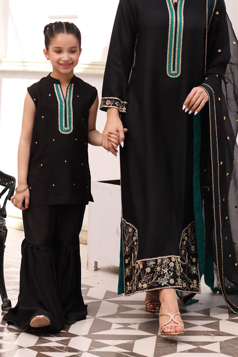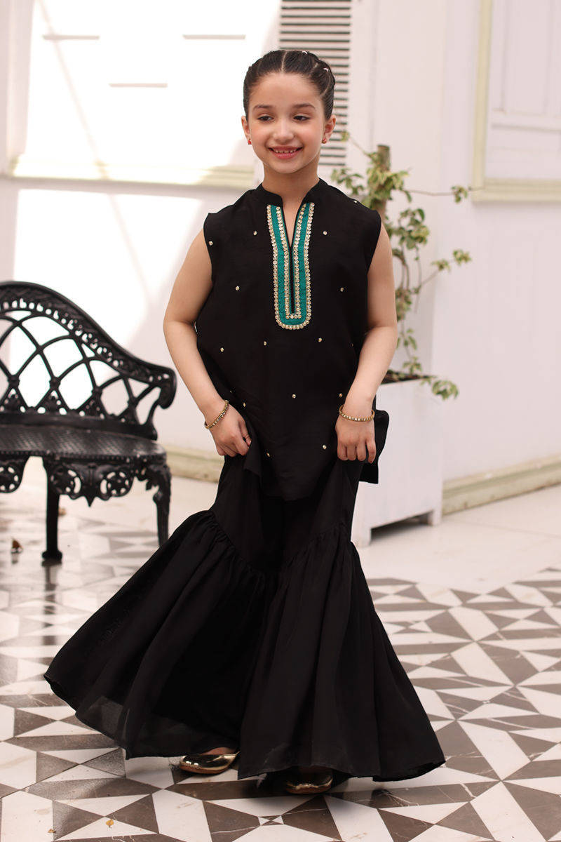 Dress your little princess in opulent style with our silk shirt, embellished with shimmering gold sitara chan and a charming green applique neckline finished with Swarovski details. Complete the look with our luxurious silk sharara, ensuring she shines with grace and sophistication.