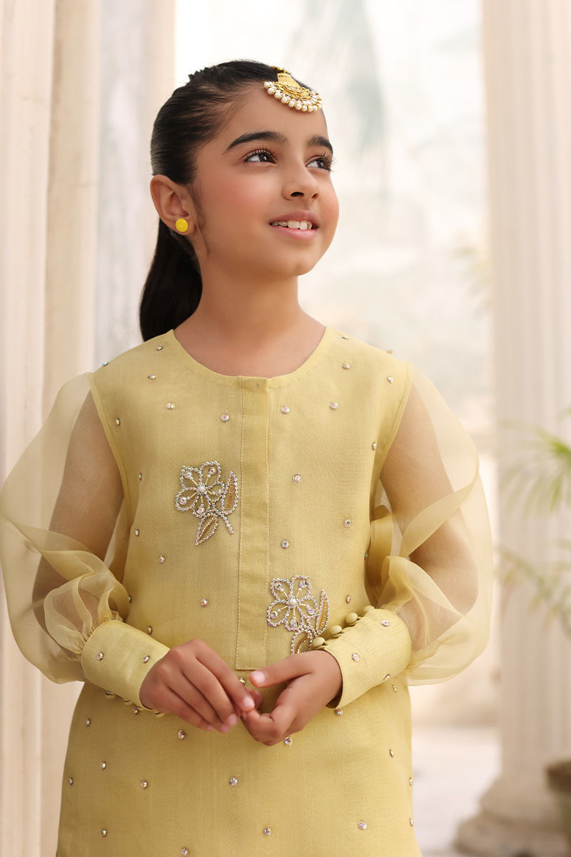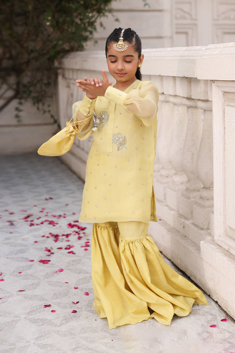 Radiate in the vibrance of our yellow organza shirt adorned with Swarovski chan embellishments throughout, featuring a Swarovski motif on the neckline and cuff sleeves. Paired elegantly with silk sharara. Embrace the perfect blend of glamour and traditional charm.