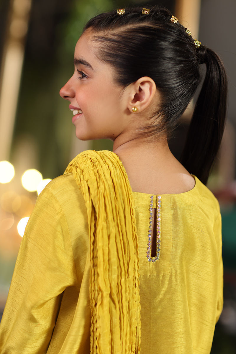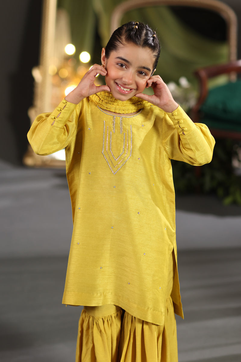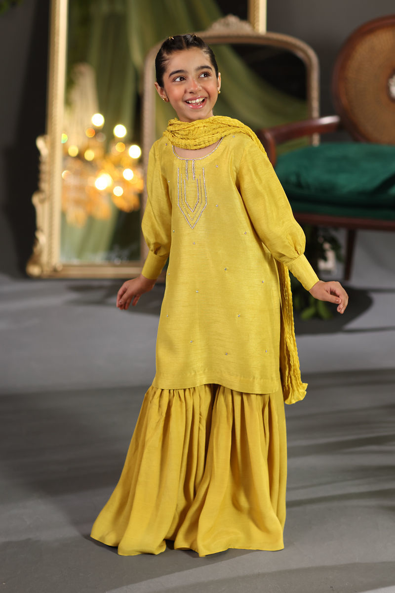 This adorable Mini Mustani is crafted from raw silk, featuring a shirt and sharara with Swarovski embellishments on the neckline, daman, and sleeves. A crushed dupatta is available as an optional addition, completing this charming look for special occasions.