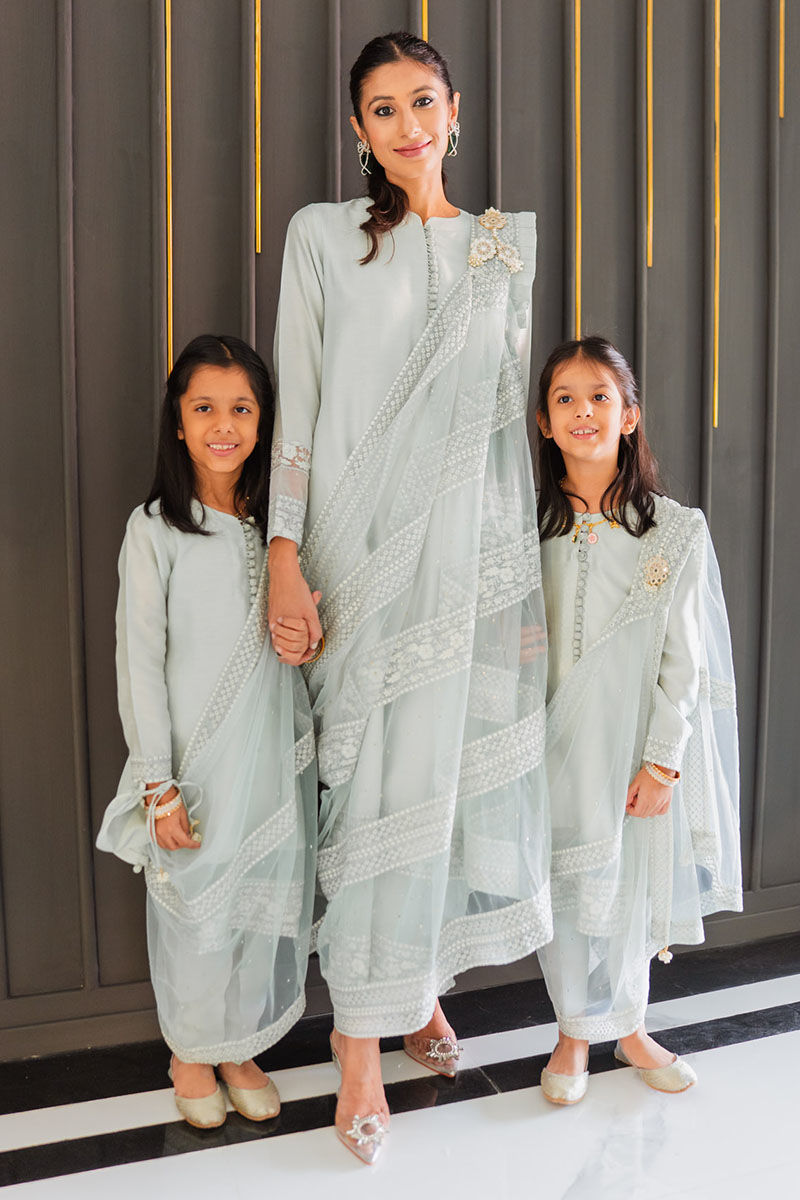 Embroidered daaman with silver tilla work and buttons on neckline. This versatile design can be paired with pearl finished sleeves and saari styled dupatta to wear at any gathering.