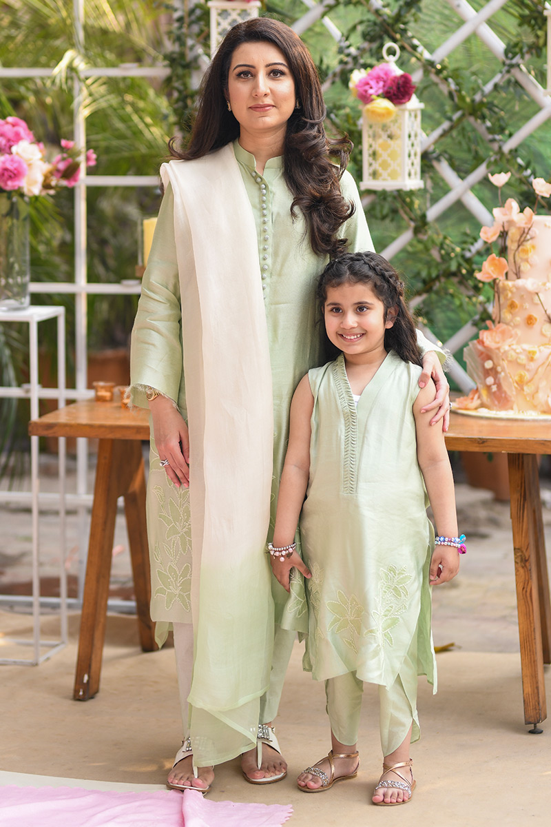 Mint green cotton net shirt with embroidered tulips on daman.
