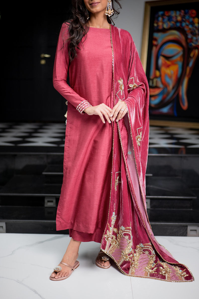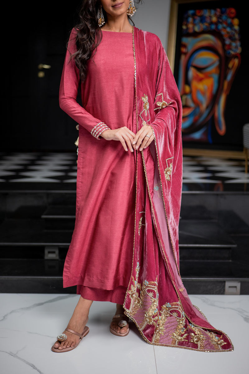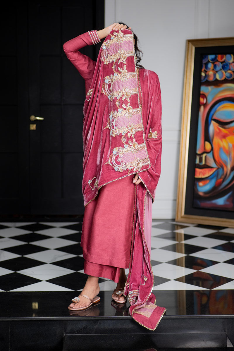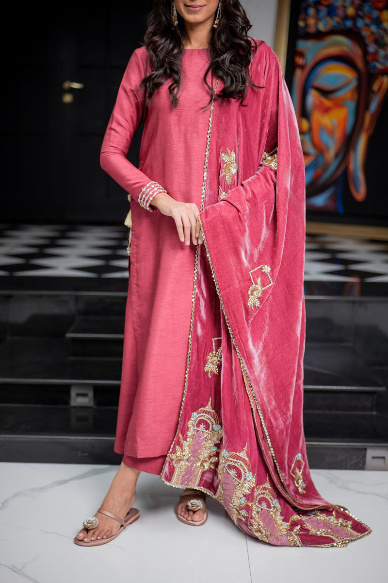 An ode to timeless grace; Mira rendered in tea pink, this look exudes soft luxury. A silk shirt and pant, delicately adorned with Swarovski details on the sleeves, perfectly complement the pure velvet shawl hand-embellished with dabka, resham, and cut daana, finished with intricate lace all around. A silhouette that whispers elegance in every fold.