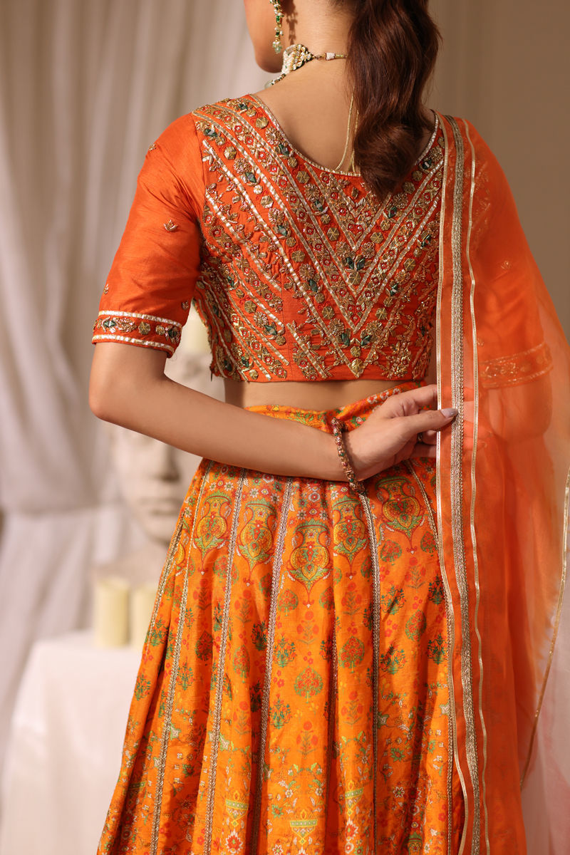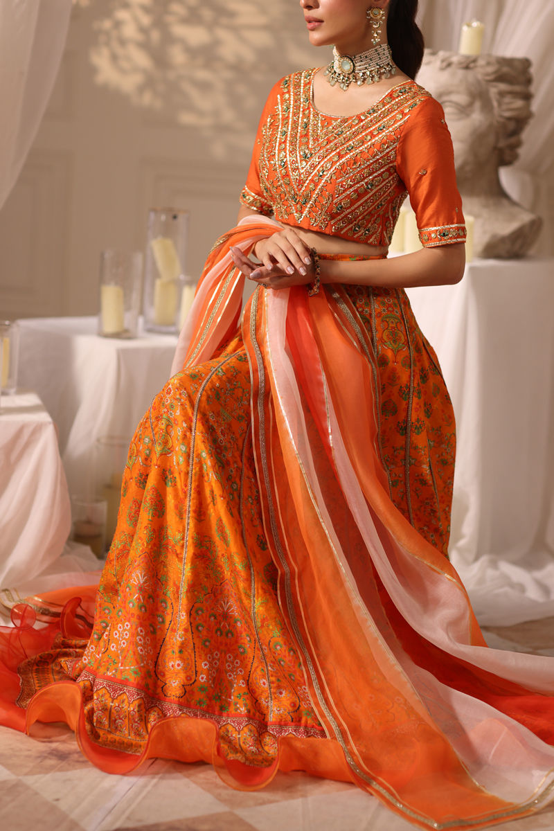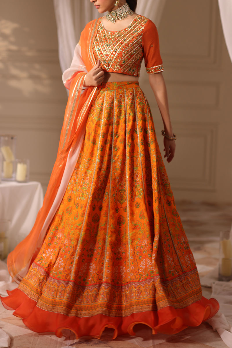 Embrace timeless elegance with our digitally printed orange Lehenga with organza frills and lace in the panels paired with a tie-dye organza dupatta in vibrant shades, finished with gold laces and dori. The choli is richly hand-embellished with resham, gota, dabka, sheesha, cutdana, and Swarovski crystals, offering a stunning blend of traditional and modern design.
