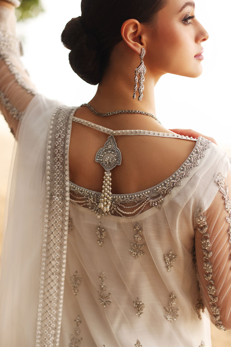 Color: White and Silver Fabric: Shirt: Net, Pants: Korean Silk Work Details: Beckti,Pearl, Cut Daana Work