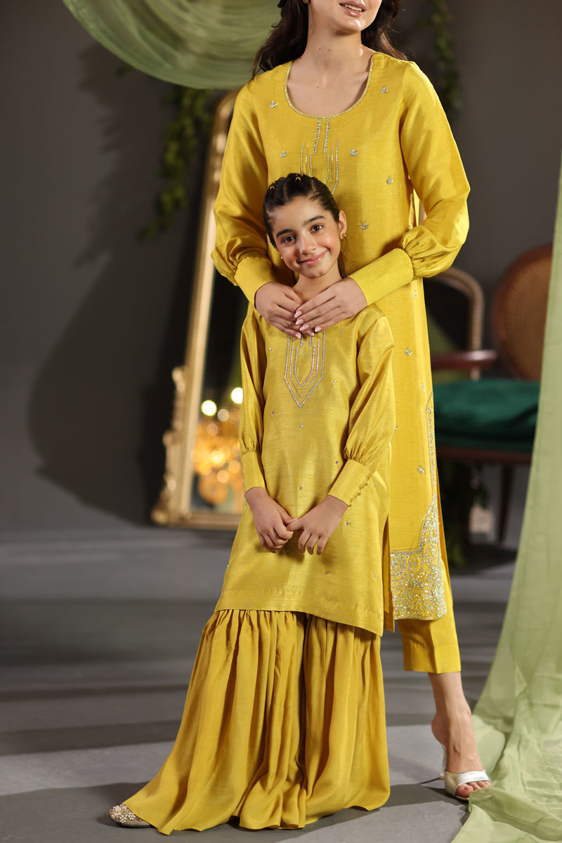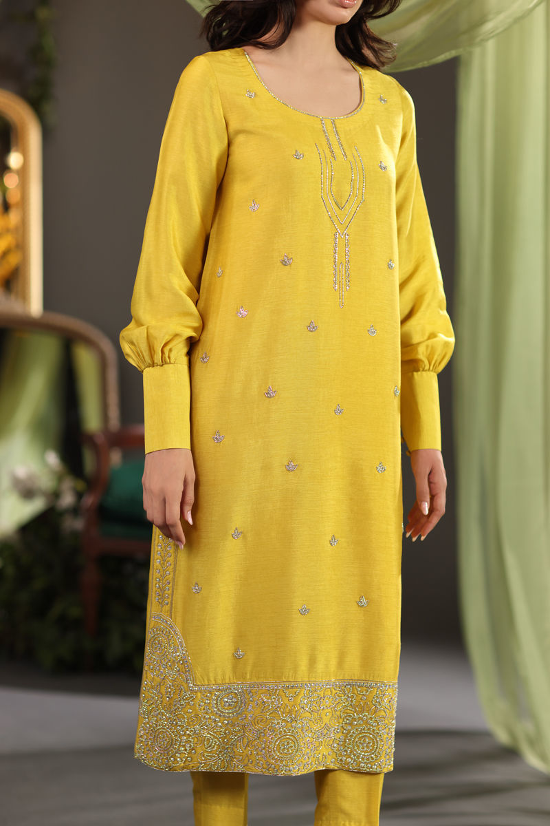 Elegance meets luxury with the Mustani dress, crafted from pure raw silk for a soft yet refined look. The shirt and pant are beautifully complemented by Swarovski embellishments on the neckline, daman, and sleeves. The graceful organza dupatta, is adorned with sparkling Swarovski and a hand-embellished border on all four corners, making it a perfect choice for any festive occasion.