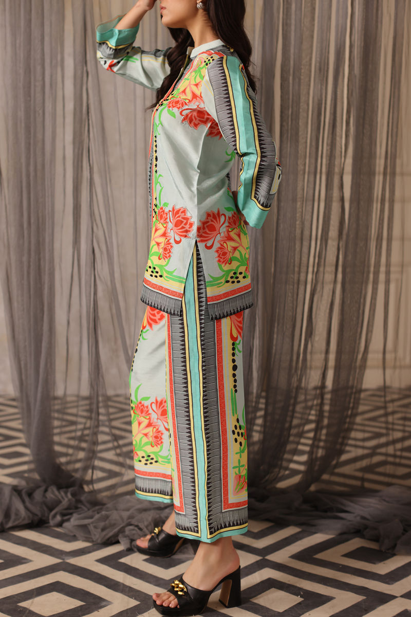 A celebration of bold contrasts, this digitally printed Korean raw silk outfit stands out with its striking embellishments of black pearls and silver cutdana. Perfectly tailored to exude confidence, this set is ideal for contemporary celebrations.